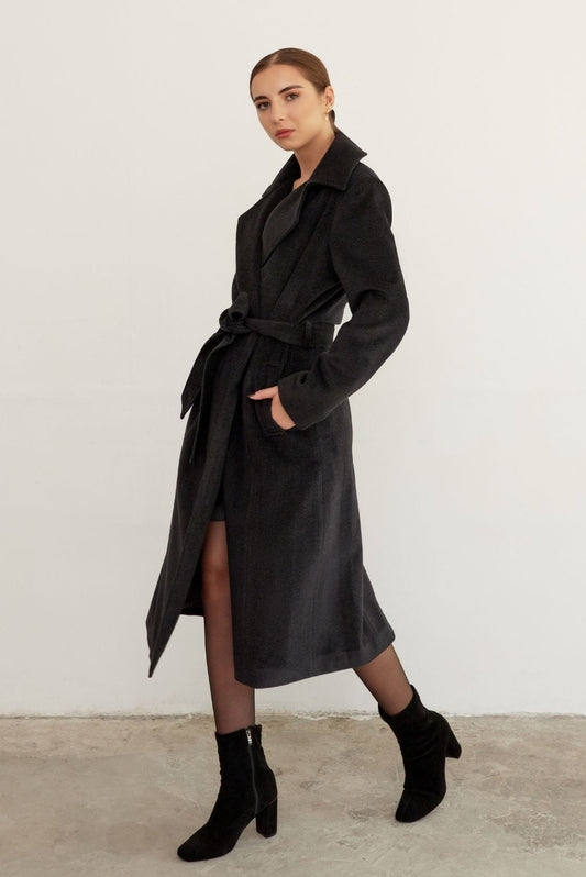 Długi płaszcz szlafrokowy z paskiem, 100% wełna, ciemny grafit - Milano