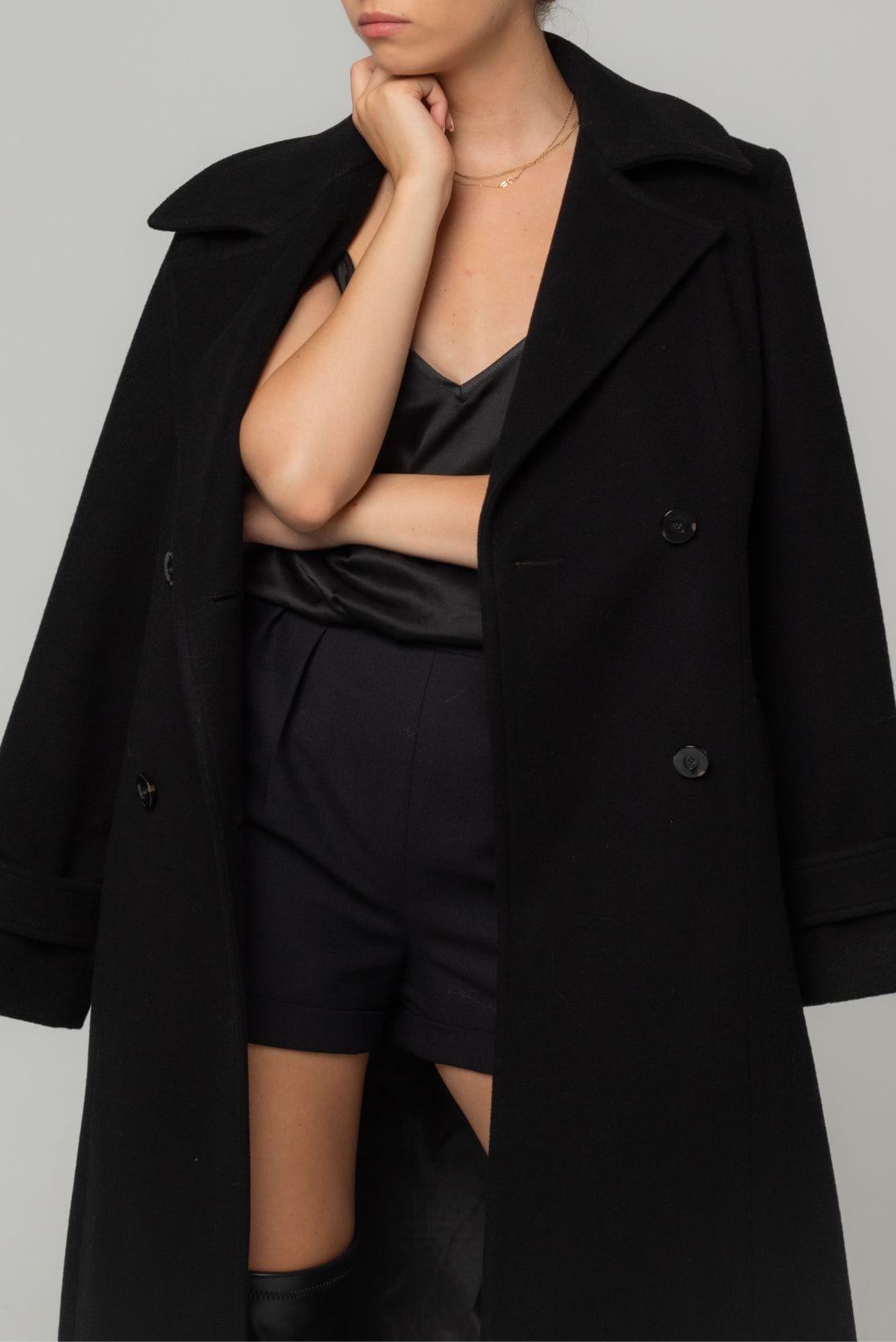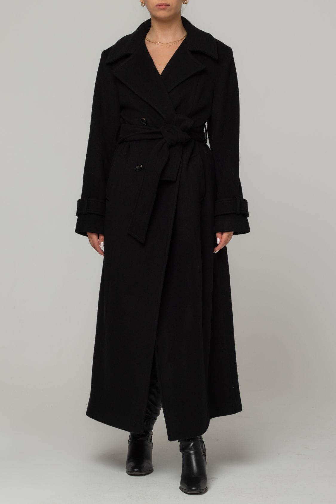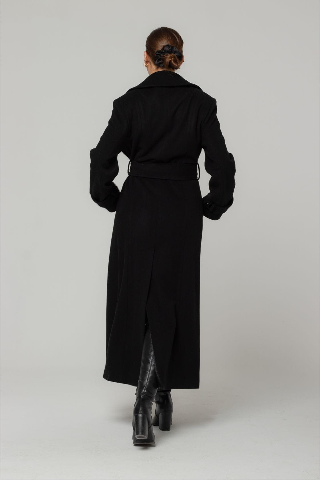 Czarny długi płaszcz do ziemi dwurzędowy z paskiem Oslo