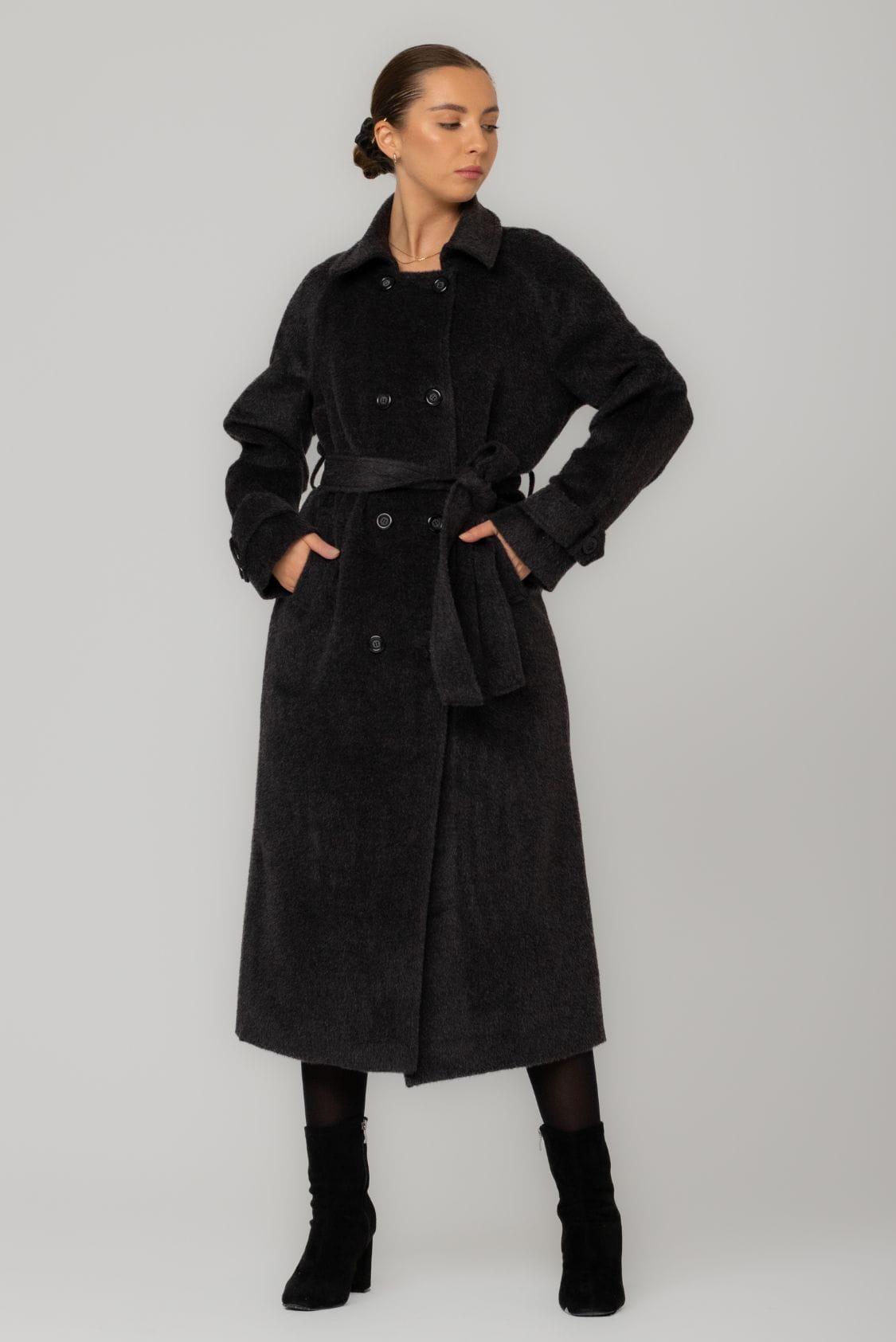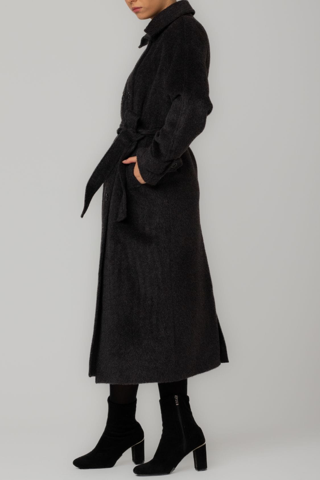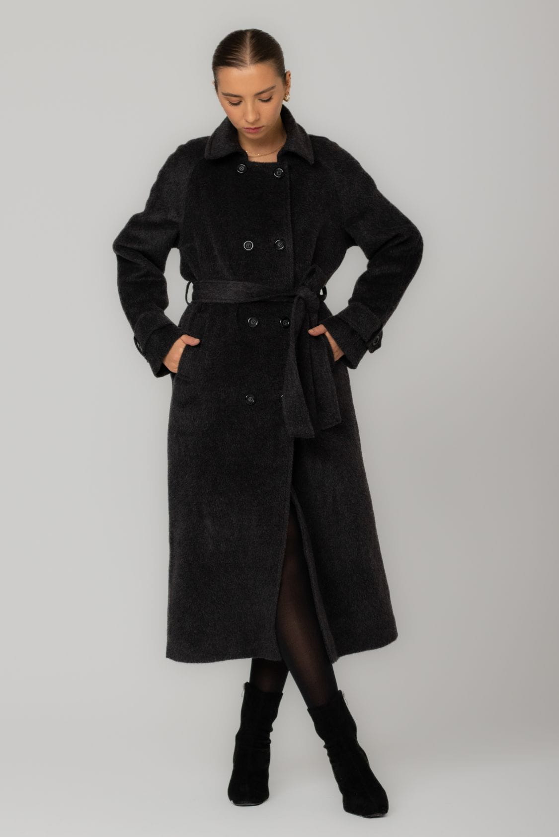 Długi płaszcz dwurzędowy z paskiem, z alpaki i wełny dziewiczej, Braga