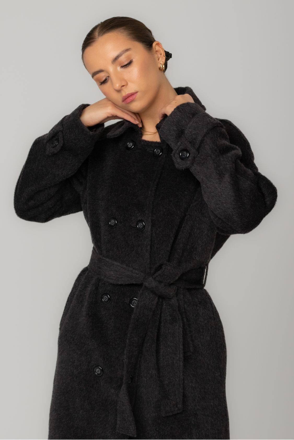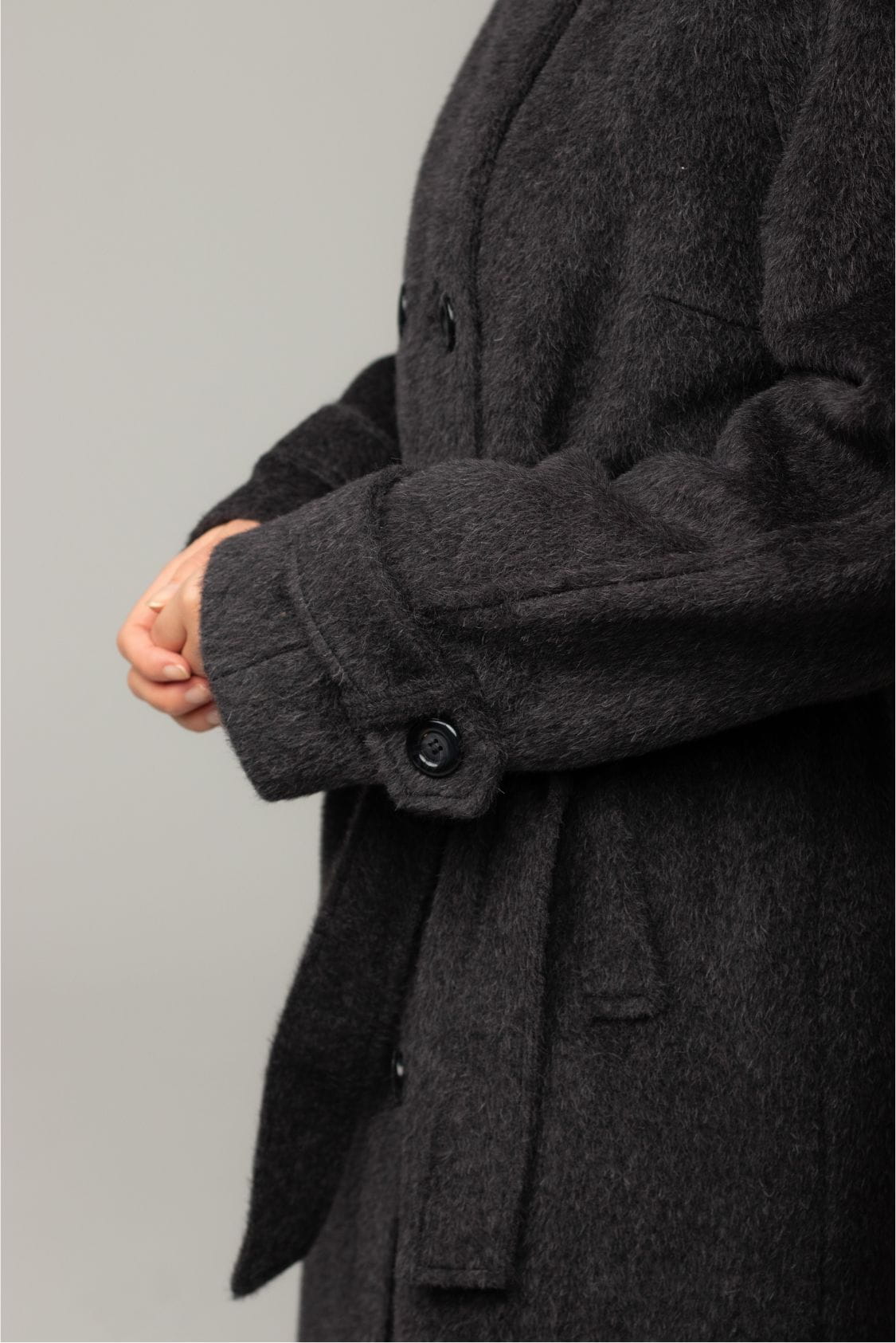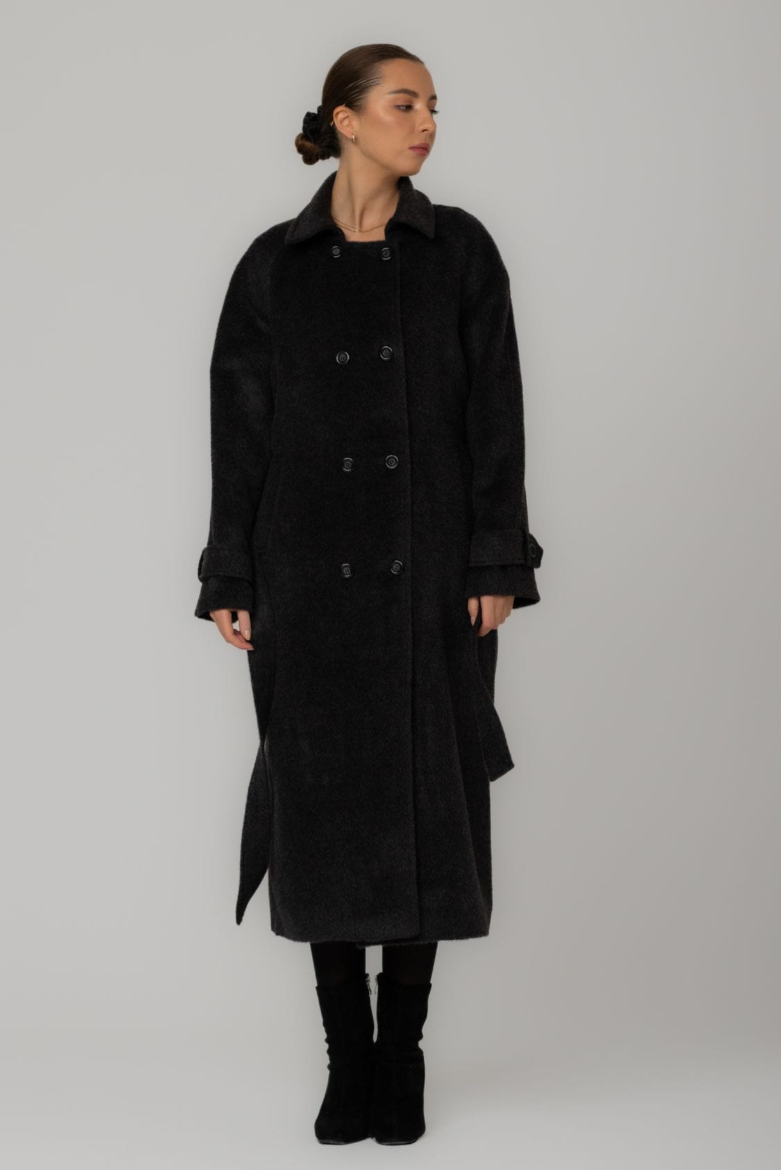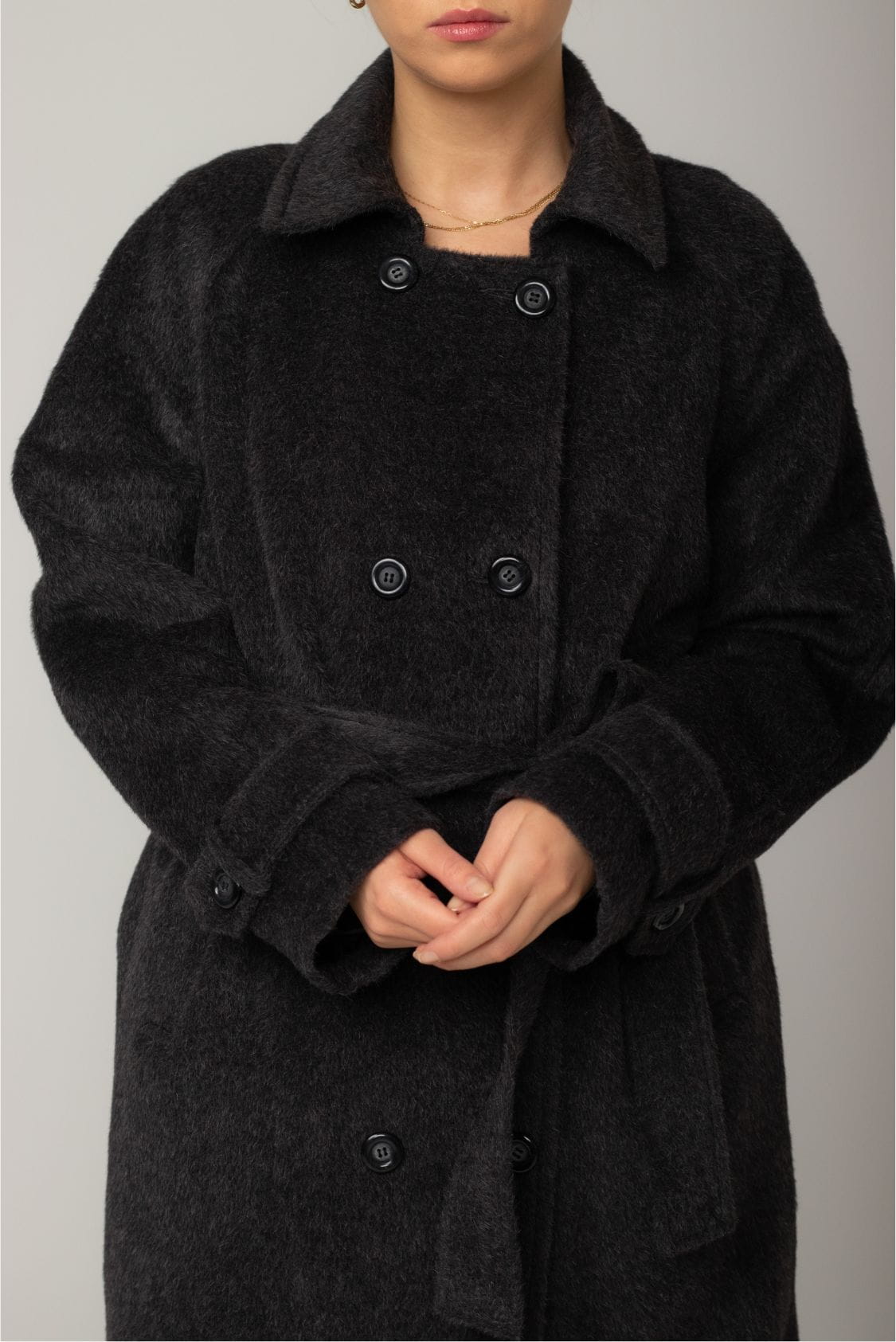 Dwurzędowy płaszcz o prostym kroju z wygodnym reglanowym rękawem, dzięki któremu bez problemu założysz pod niego marynarkę czy oversize'owy sweter. Na dole rękawów znajdują się ozdobne patki zapinane na guzik. Płaszcz posiada dwie, wpuszczane kieszenie, dwa rzędy guzików oraz dodatkowy pasek podkreślający talię. Kołnierz posiada dwie możliwości ułożenia - zapięty na wszystkie guziki pod szyją lub z wyłożonym kołnierzem. Z tyłu, na dole płaszcza znajduje się pęknięcie wydłużające optycznie sylwetkę, dzięki któremu płaszcz jest komfortowy w chodzeniu, mimo długości maxi.
