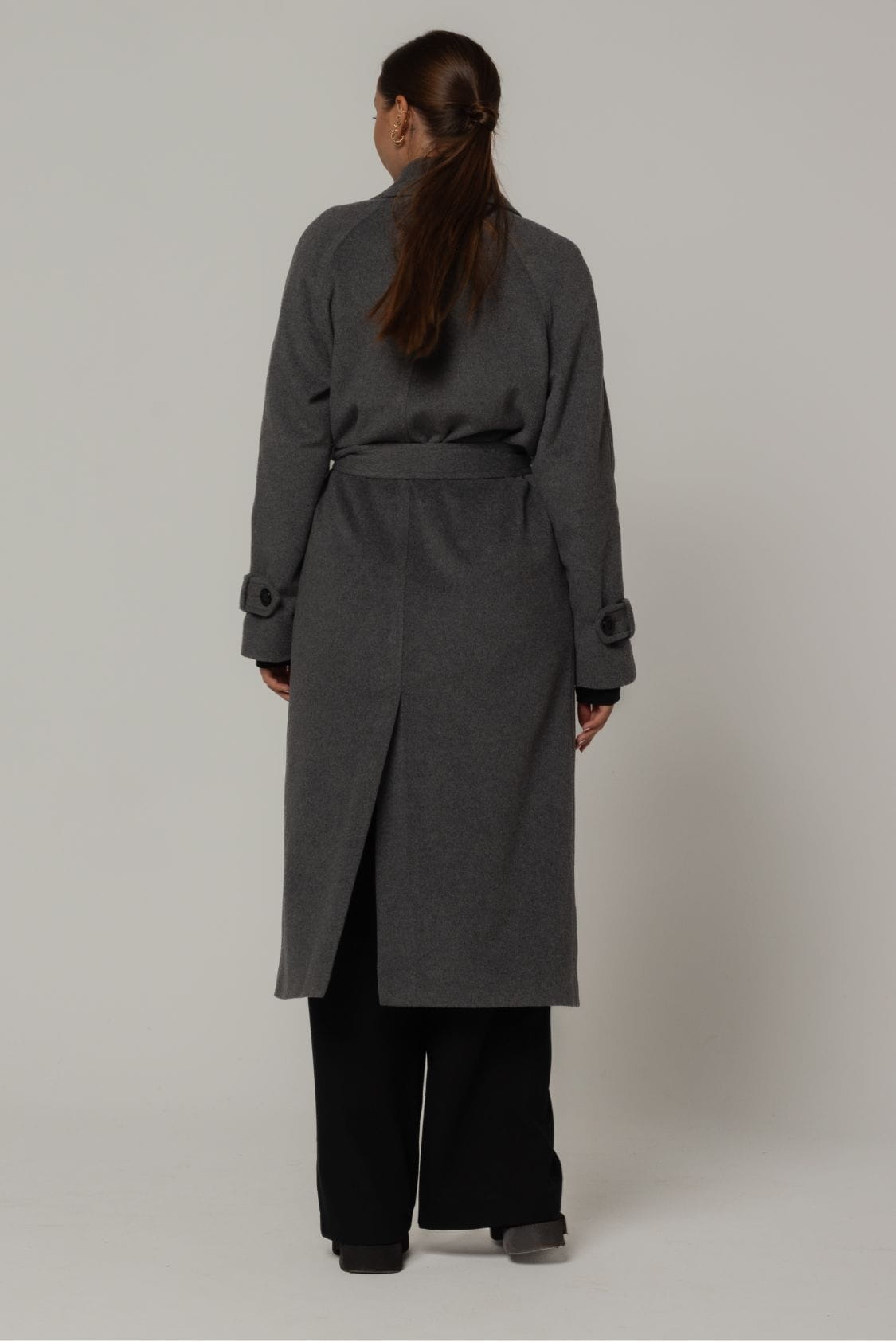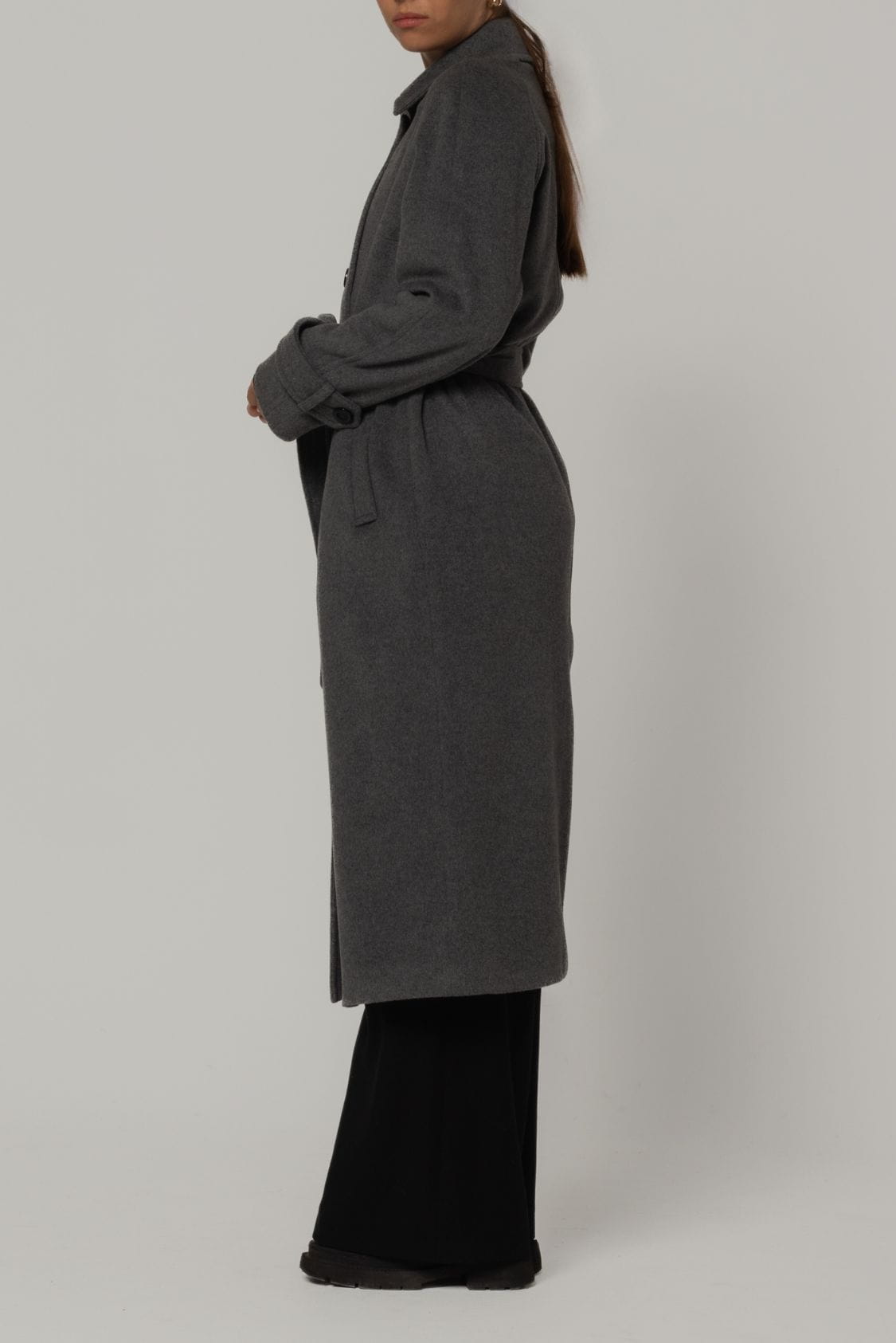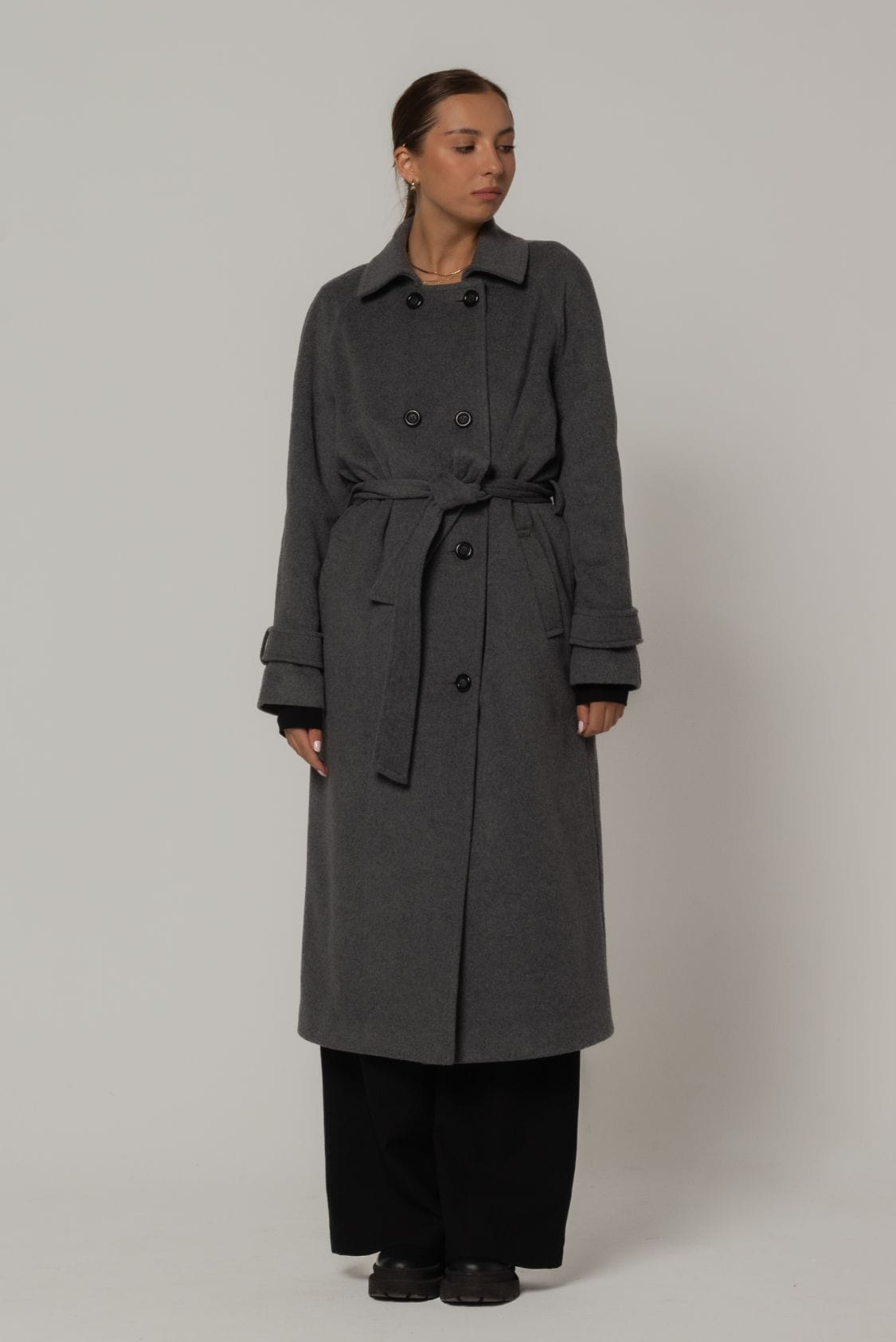 Dwurzędowy płaszcz o prostym kroju i wygodnym reglanowym rękawie. Pasuje idealnie zarówno do marynarki, jak i oversize'owego swetra. Ozdobne patki zapinane na guzik znajdują się na dolnych częściach rękawów. Płaszcz ma dwie wpuszczane kieszenie, dwa rzędy guzików i dodatkowy pasek, który podkreśla talię. Kołnierz można nosić na dwa sposoby - zapięty na wszystkie guziki pod szyją lub z wyłożonym kołnierzem. Z tyłu, na dole płaszcza, jest pęknięcie, które optycznie wydłuża sylwetkę i zapewnia wygodę podczas chodzenia, pomimo długości maxi.