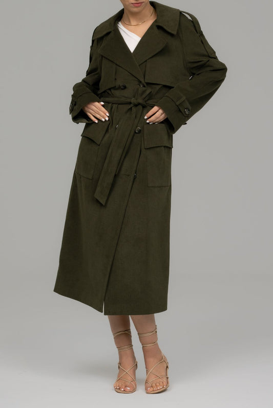Trencz oversize dwurzędowy, z paskiem z weluru - Lima