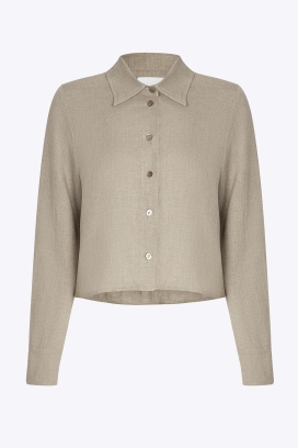 Klasyczna lniana krótka koszula damska o delikatnym oversizym kroju, zapinana na guziki. Zaprojektowana i uszyta w naszej lokalnej szwalni na terenie województwa świętokrzyskiego.