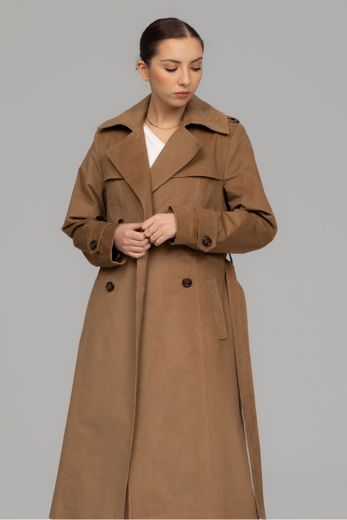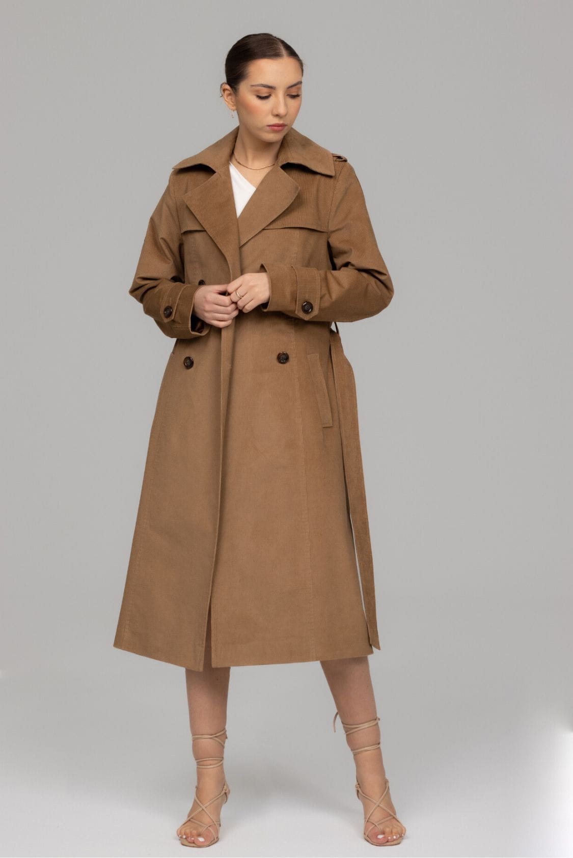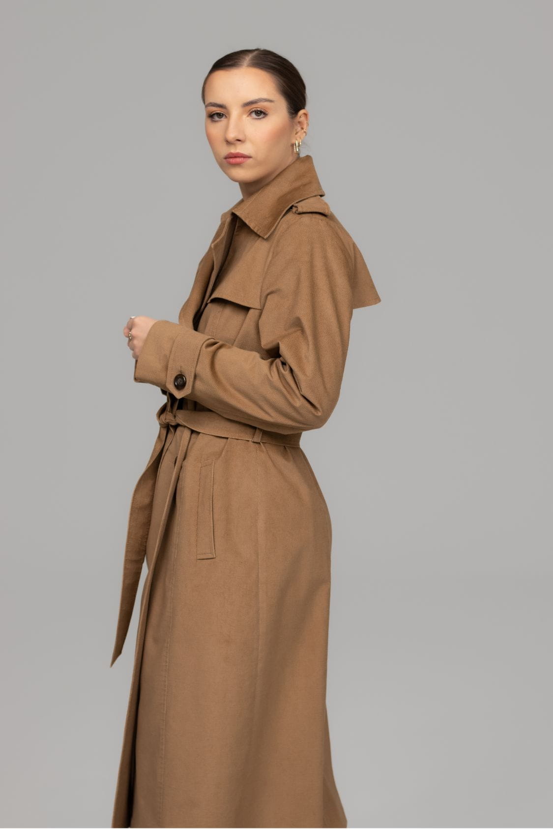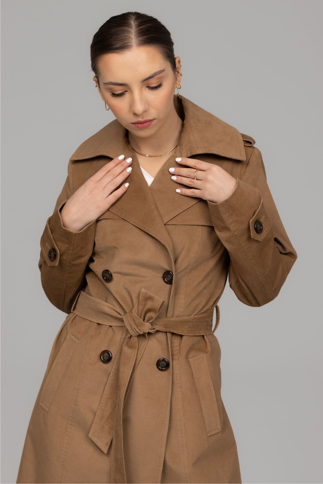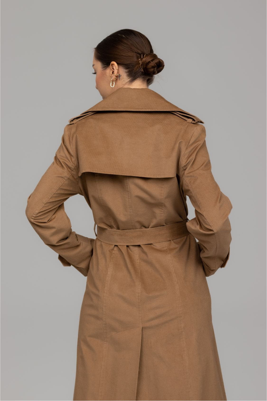 Bergen to ponadczasowy, klasyczny trencz z dwoma rzędami guzików o taliowanym kroju. Wykonany z miłej w dotyku bawełny o welurowym wykończeniu, co wpływa na miękkość tkaniny i niepowtarzalny komfort noszenia. Posiada klasycznie wszyty rękaw, który wysmukla sylwetkę. Na dole rękawów znajdują się ozdobne patki zapinane na guzik. Trencz Bergen posiada dwie, wpuszczane kieszenie, dwa rzędy guzików oraz dodatkowy pasek podkreślający talię. Z tyłu, na dole płaszcza znajduje się pęknięcie wydłużające optycznie sylwetkę, dzięki któremu trencz jest komfortowy w chodzeniu.