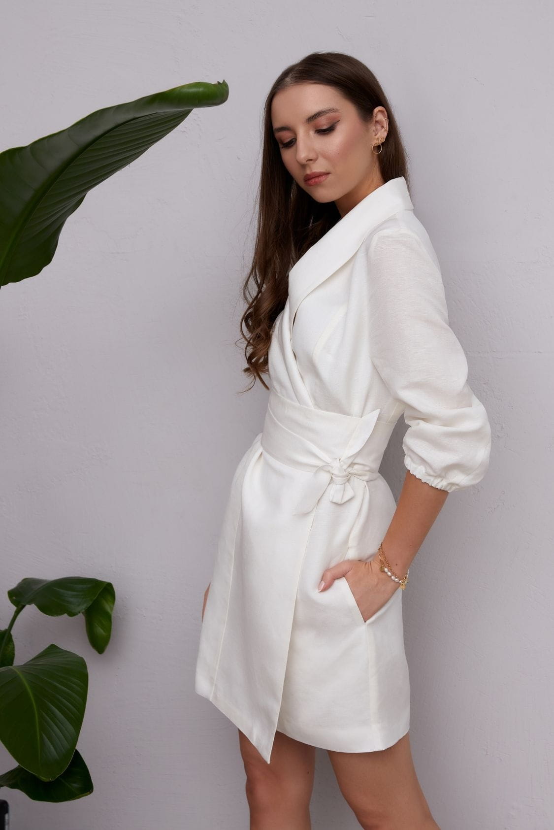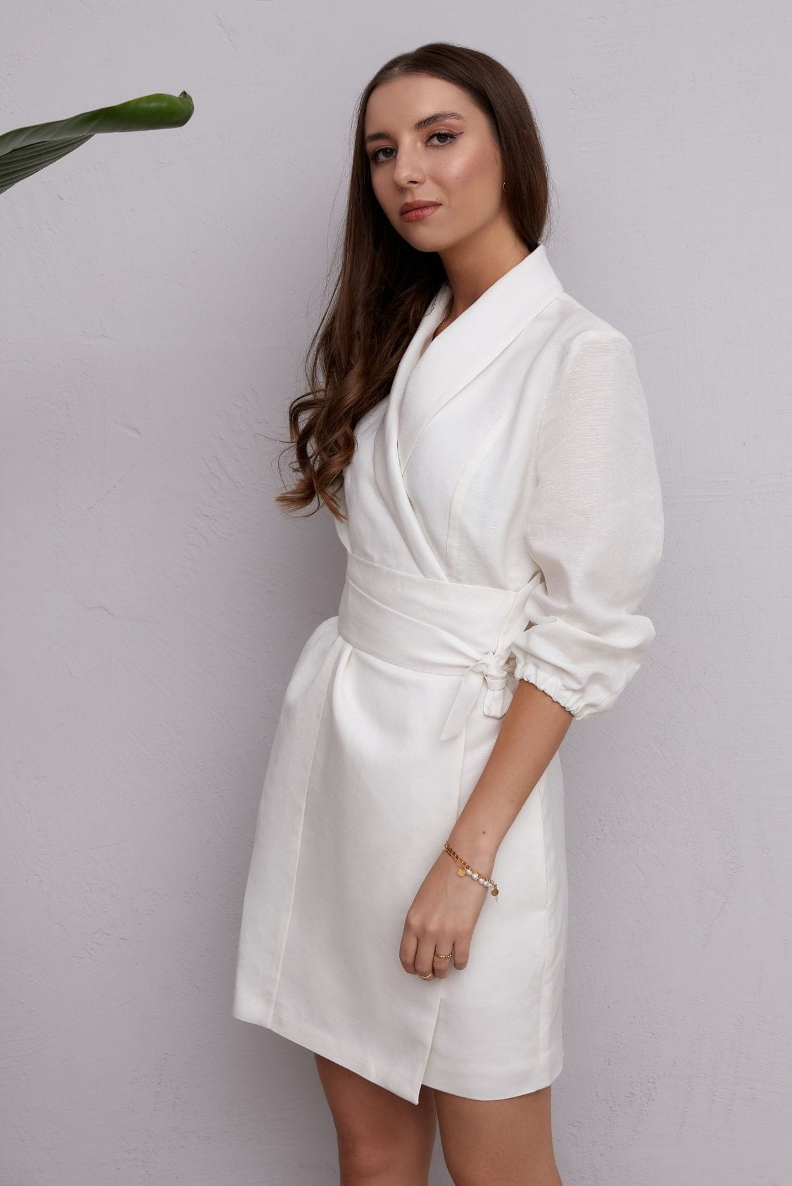Biała lniana sukienka zakładana a'la marynarka krótka