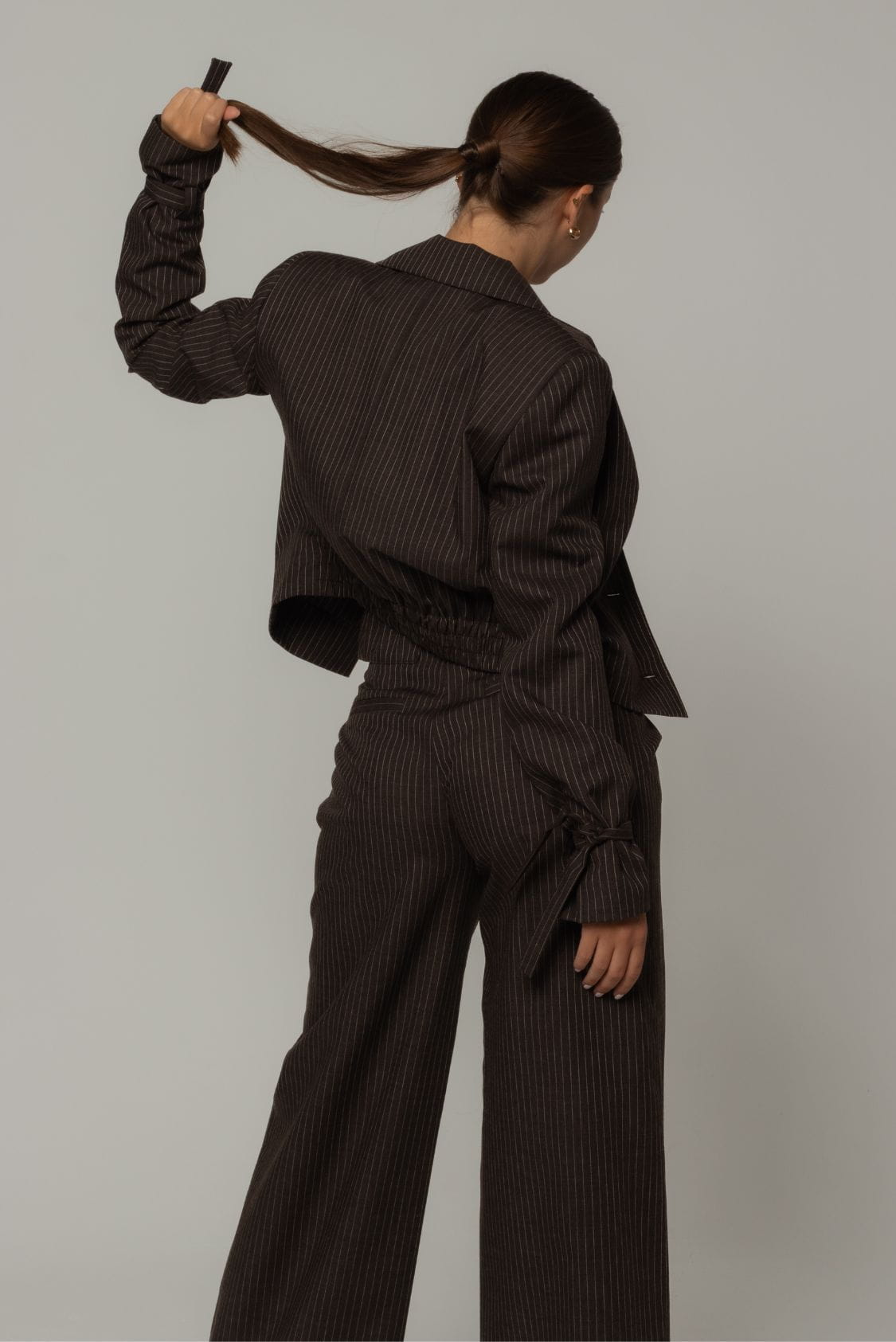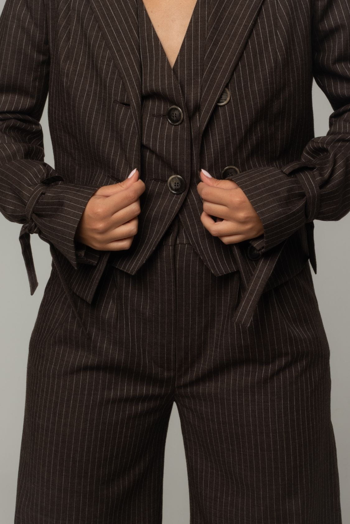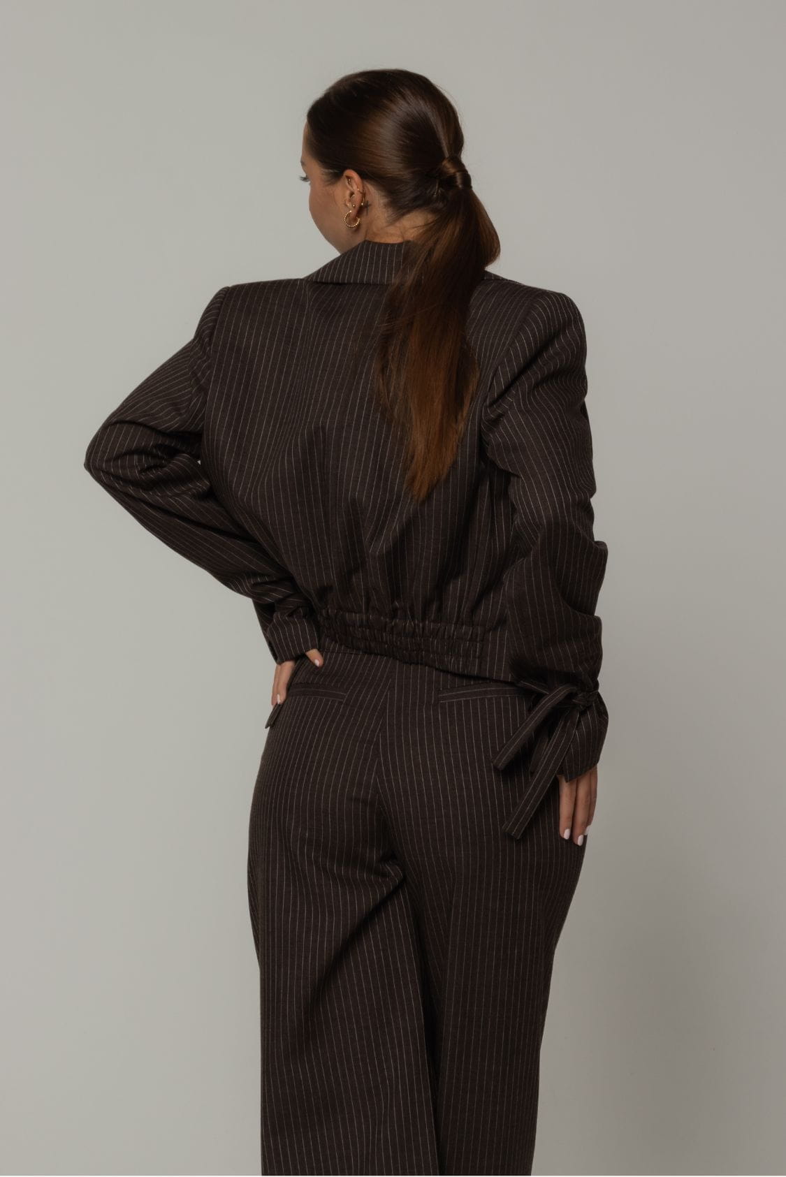 Krótka marynarka damska uszyta z włoskiej wełny jagnięcej w kolorze brązowym z delikatnym prążkiem, posiada delikatne wkłady barkowe oraz gumkę w talii, dzięki czemu jest ona efektownie podkreślona. Z przodu marynarka posiada jeden rząd guzików i kołnierz revers. To połączenie klasycznego designu, komfortu i troski o środowisko.