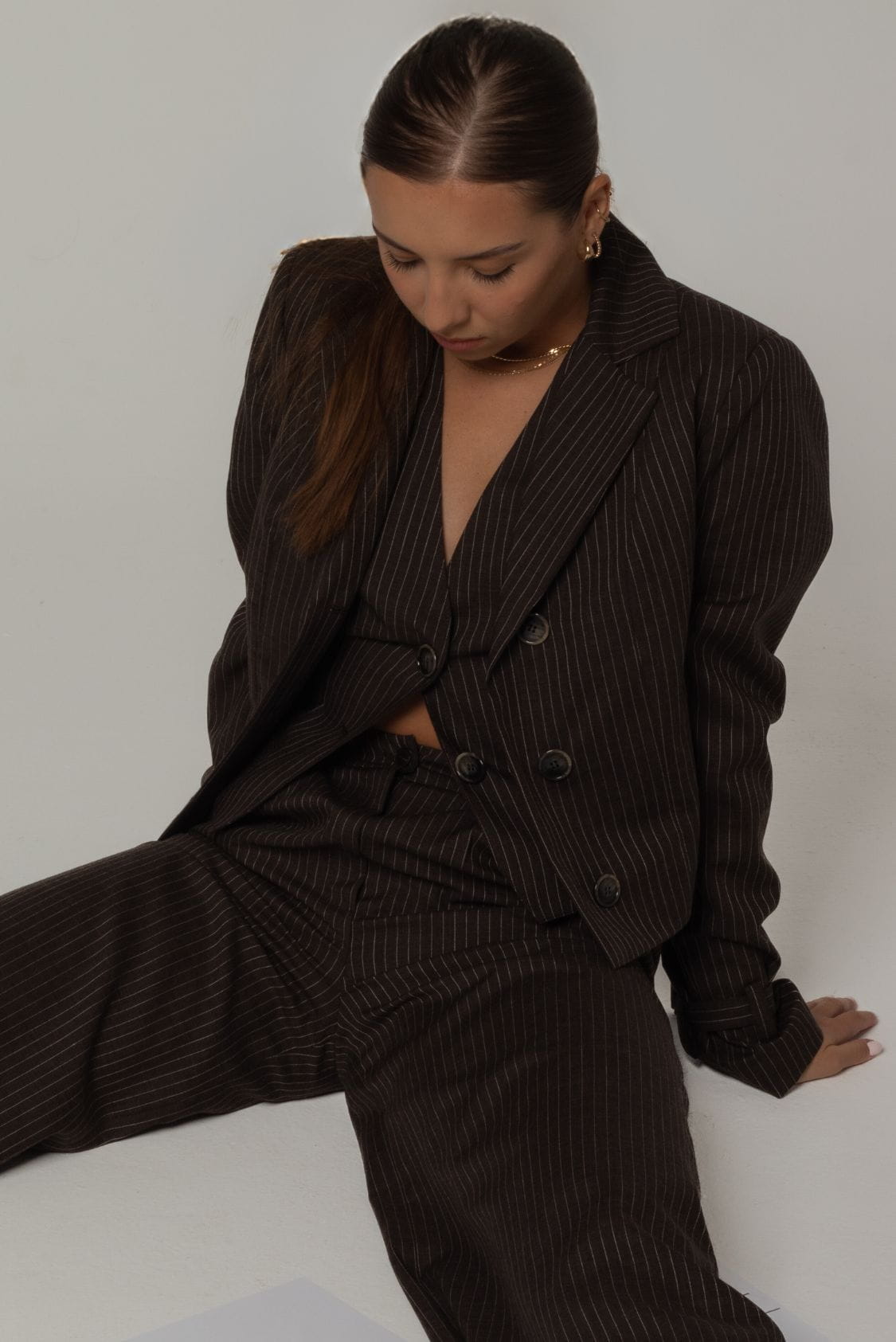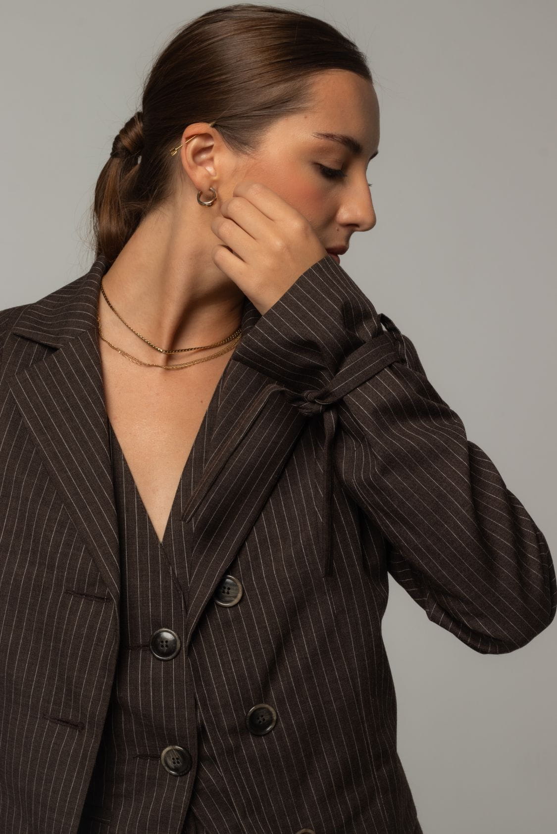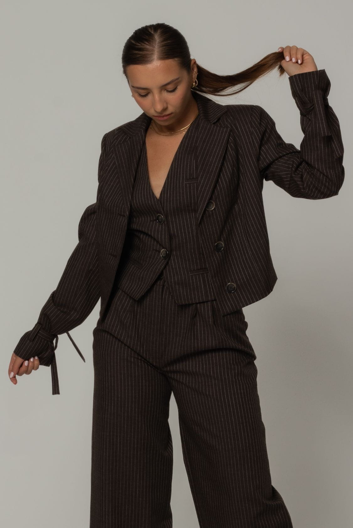 Krótka marynarka damska uszyta z włoskiej wełny jagnięcej w kolorze brązowym z delikatnym prążkiem, posiada delikatne wkłady barkowe oraz gumkę w talii, dzięki czemu jest ona efektownie podkreślona. Z przodu marynarka posiada jeden rząd guzików i kołnierz revers. To połączenie klasycznego designu, komfortu i troski o środowisko.