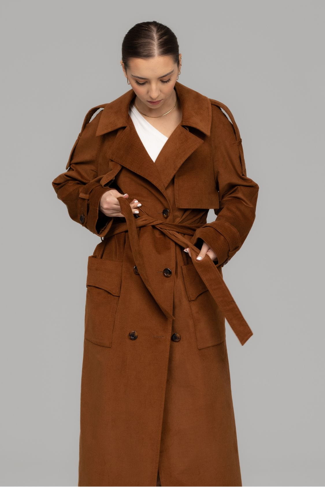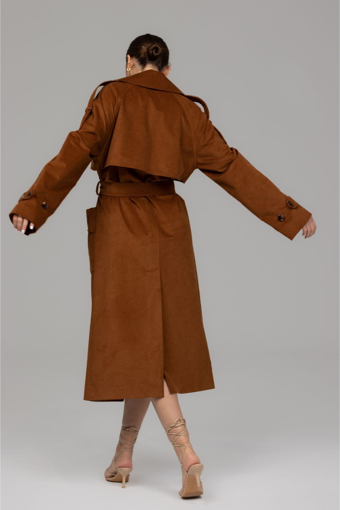 Brązowy trencz oversize dwurzędowy, z paskiem z weluru - Lima