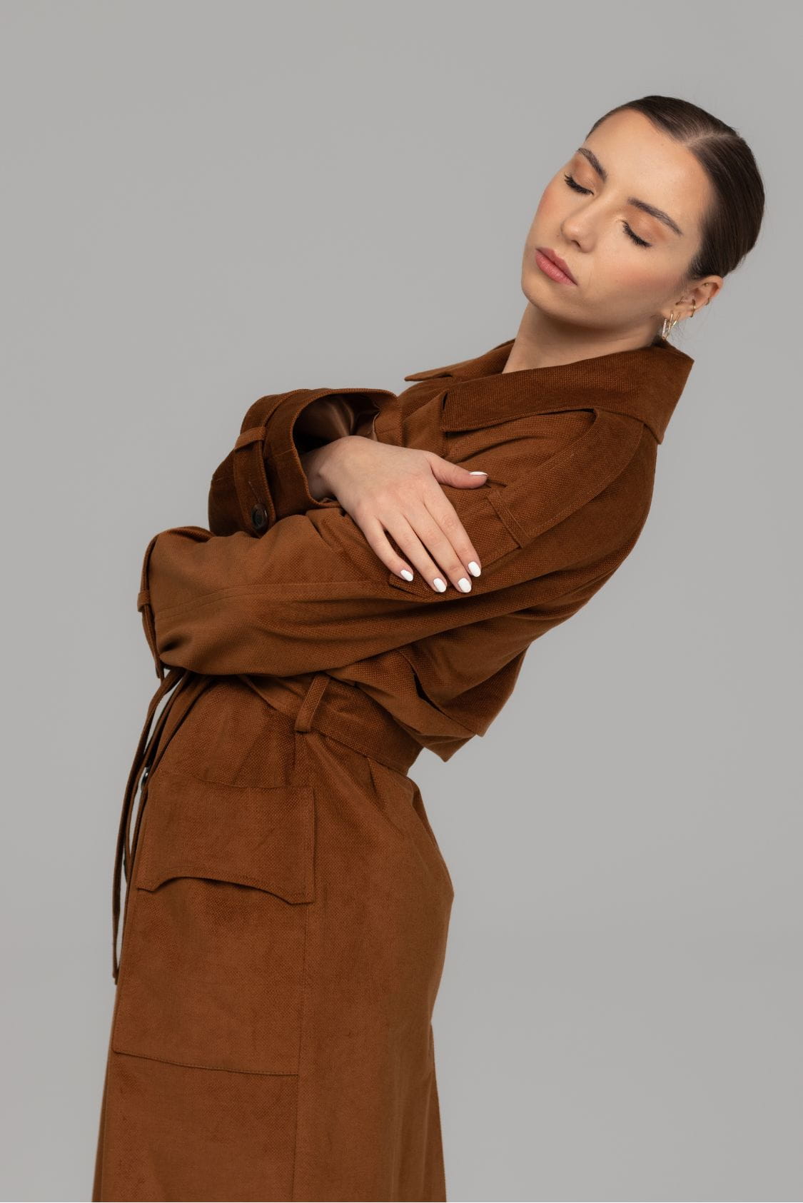 Lima to ponadczasowy, lekko oversize'owy trencz z dwoma rzędami guzików o prostym kroju i długości maxi. Wykonany z miłej w dotyku bawełny o welurowym wykończeniu, co wpływa na miękkość tkaniny i niepowtarzalny komfort noszenia. Posiada dłuższe pagony i raglanowe rękawy, które są bardzo wygodne, niezależnie co założysz pod trencz. Na dole rękawów znajdują się ozdobne patki zapinane na dwa guziki do wyboru - zależy jaki efekt chcesz osiągnąć. Trencz Lima posiada dwie, naszywane kieszenie, dwa rzędy guzików oraz dodatkowy pasek podkreślający talię. Z tyłu, na dole płaszcza znajduje się pęknięcie wydłużające optycznie sylwetkę, dzięki któremu trencz jest komfortowy w chodzeniu.
