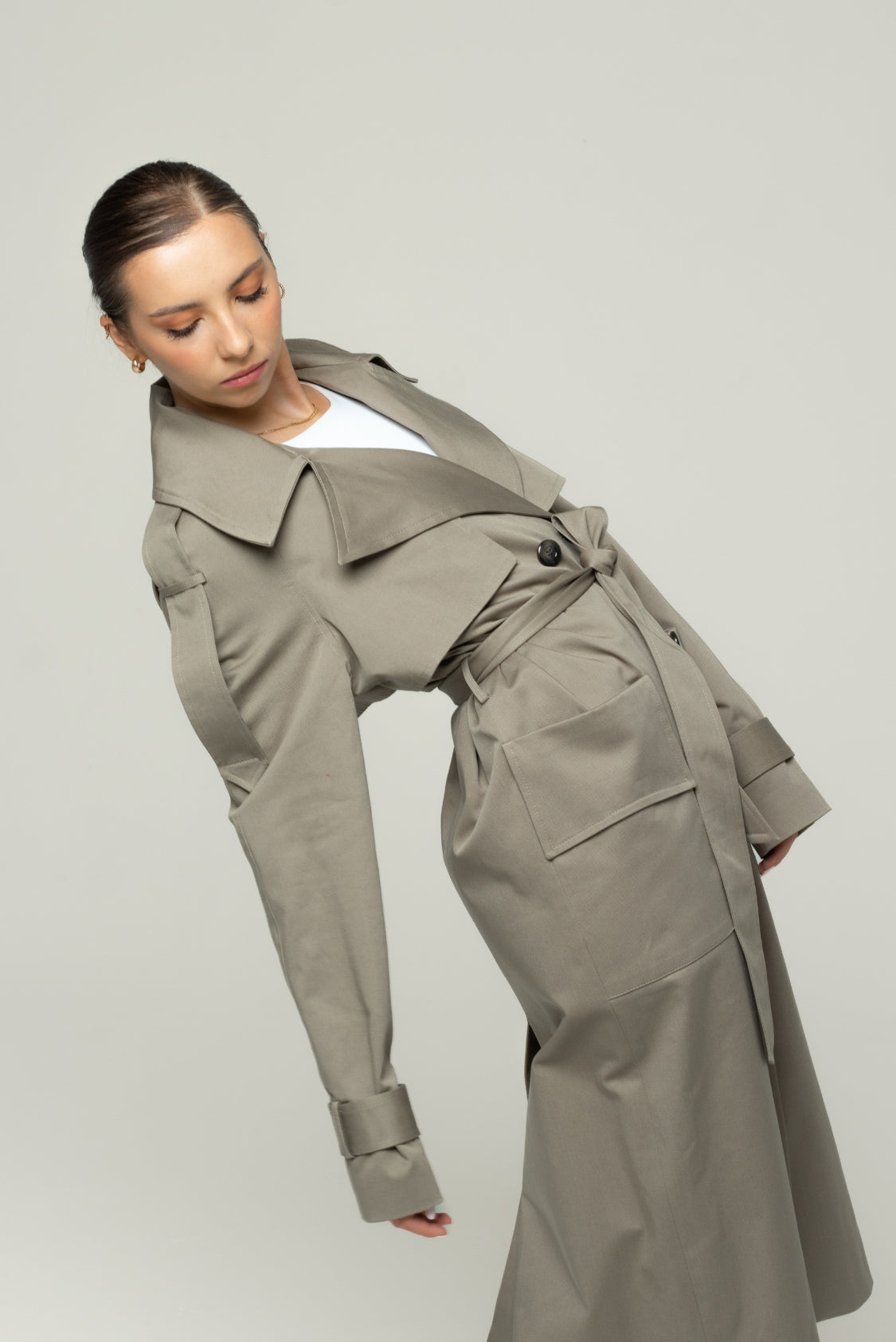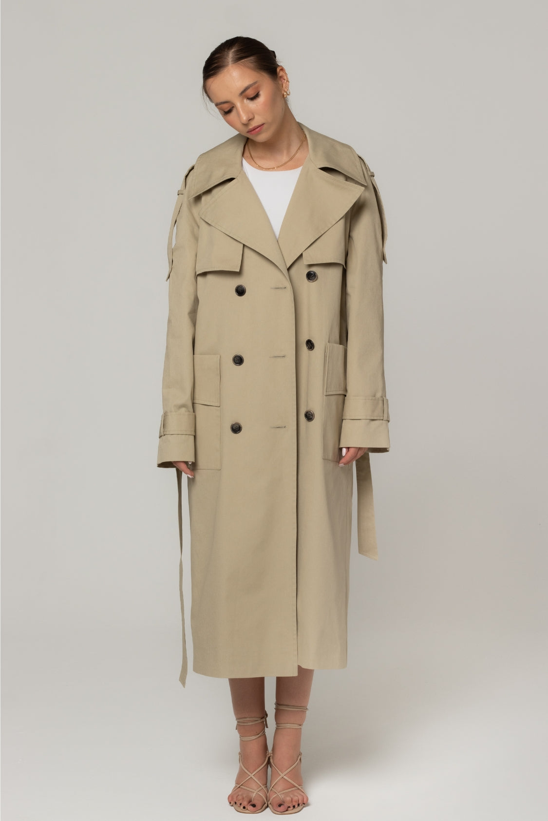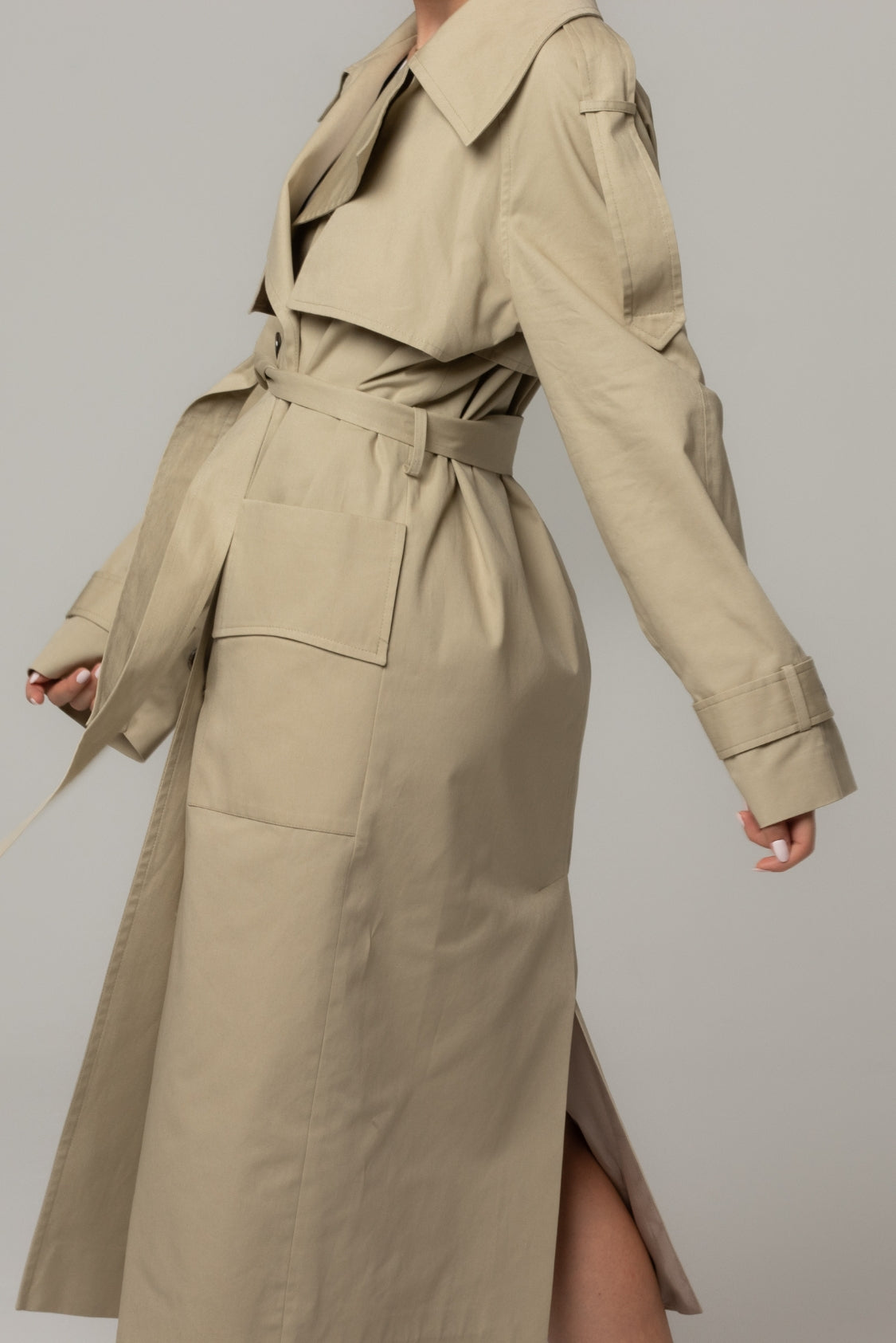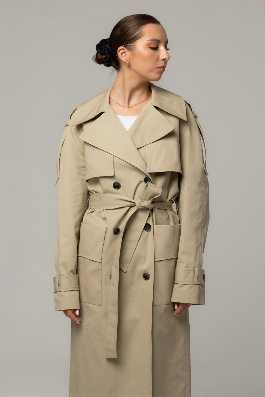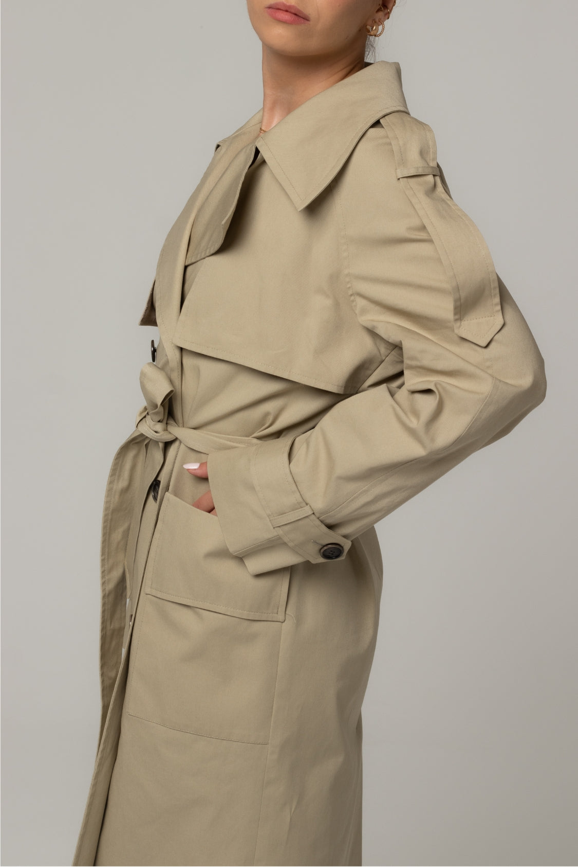Lima to klasyczny trencz z dwoma rzędami guzików o prostym maxi kroju. Posiada reglanowy rękaw, dłuższe pagony i reglanowe rękawy, które zapewniają wysoki komfort noszenia. Na dole rękawów znajdują się ozdobne patki zapinane na dwa guziki do wyboru - węższe zapięcie dodaje efekt charakterystycznej bufki. Trencz Lima posiada dwie, naszywane kieszenie, dwa rzędy guzików oraz dodatkowy pasek podkreślający talię. Z tyłu, na dole płaszcza znajduje się pęknięcie wydłużające optycznie sylwetkę, dzięki któremu trencz jest komfortowy w chodzeniu, mimo długości maxi.