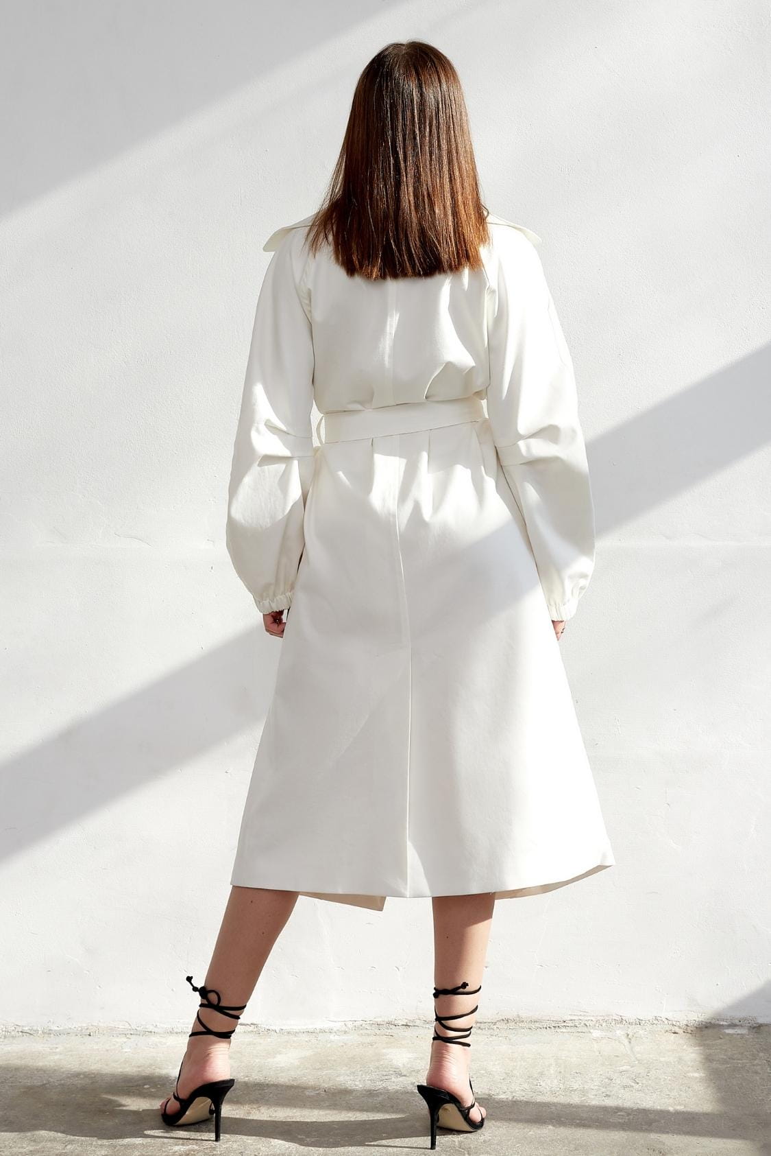 Namur - długi, ponadczasowy trencz o oversizowym kroju z efektownie podkreśloną szerokim paskiem talią. Trencz posiada reglanowy rękaw, który zapewnia wysoki komfort noszenia - bez obaw możesz stylizować go wielowarstwowo. Rękawy są zakończone gumką i posiadają geometryczny, sportowy charakter, dzięki zakładkom przy łokciach. Zadbałyśmy o to, aby trencz zachwycił Cię jakością wykonania i każdym szczegółem. Z tyłu, na dole płaszcza znajduje się pęknięcie wydłużające optycznie sylwetkę, dzięki któremu trencz jest komfortowy w chodzeniu, mimo długości maxi.
