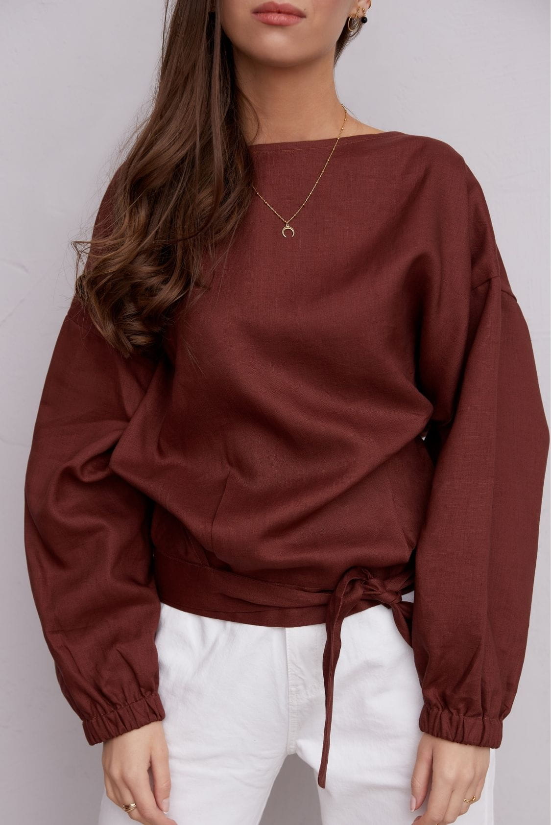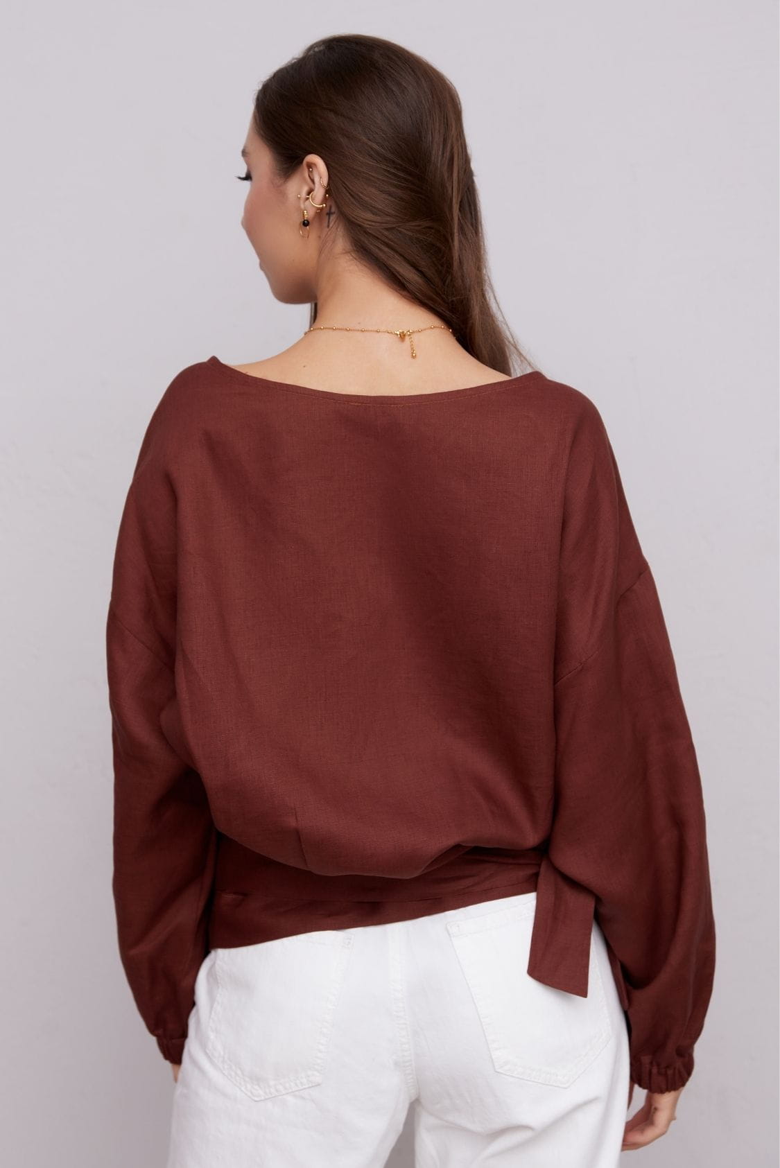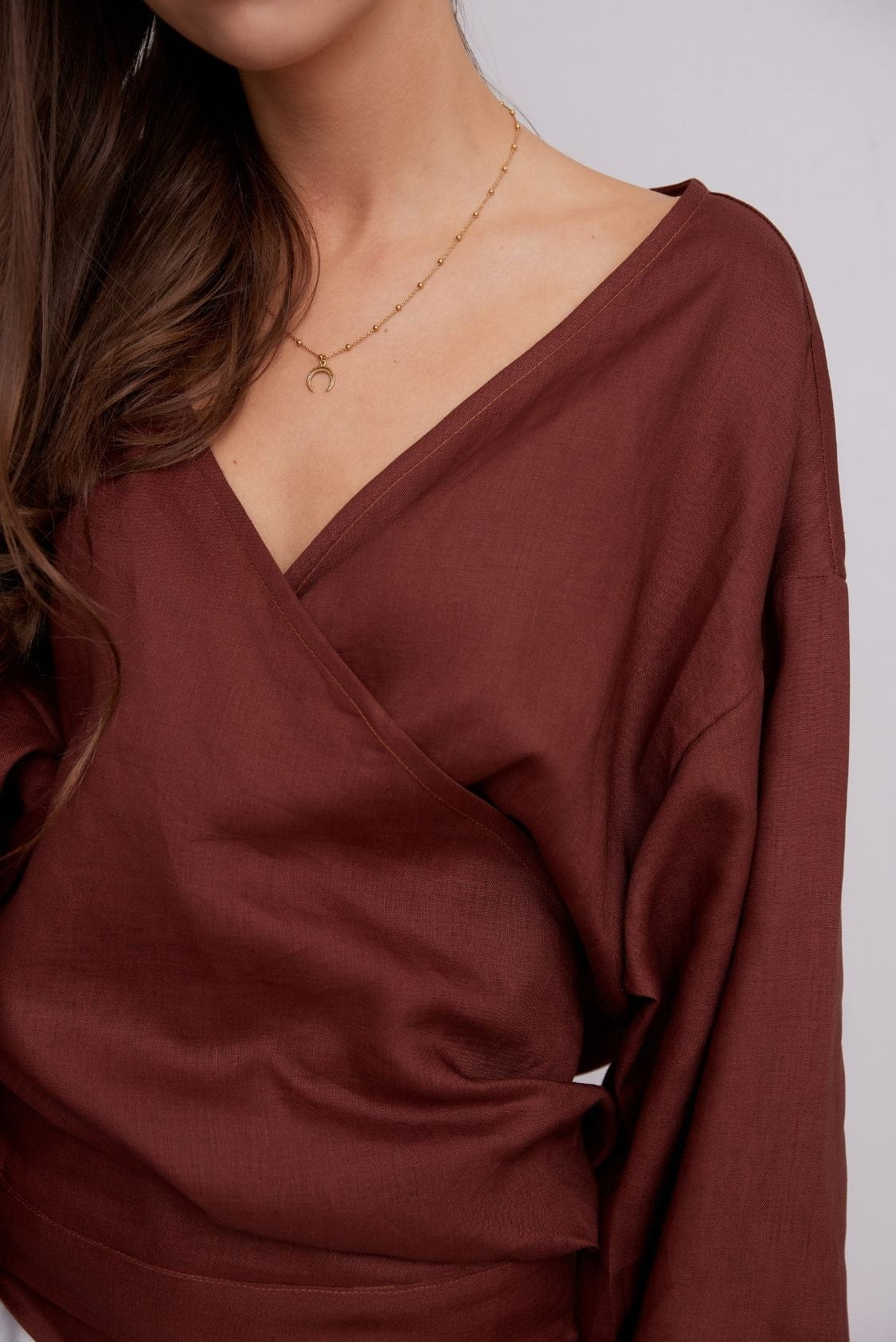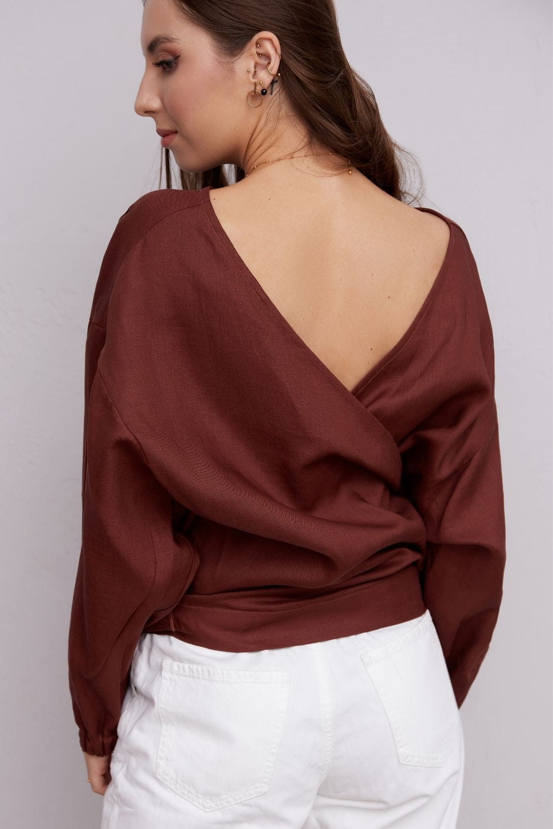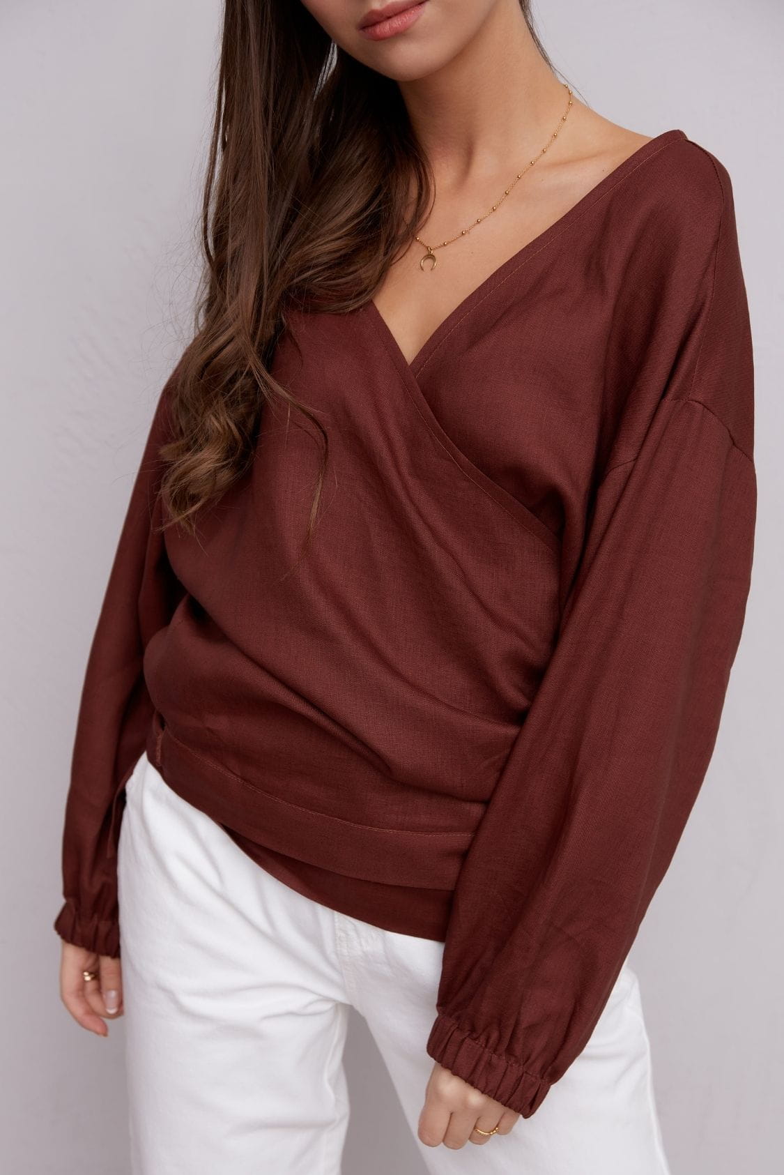 Marsala lniana bluzka kopertowa z długim rękawem