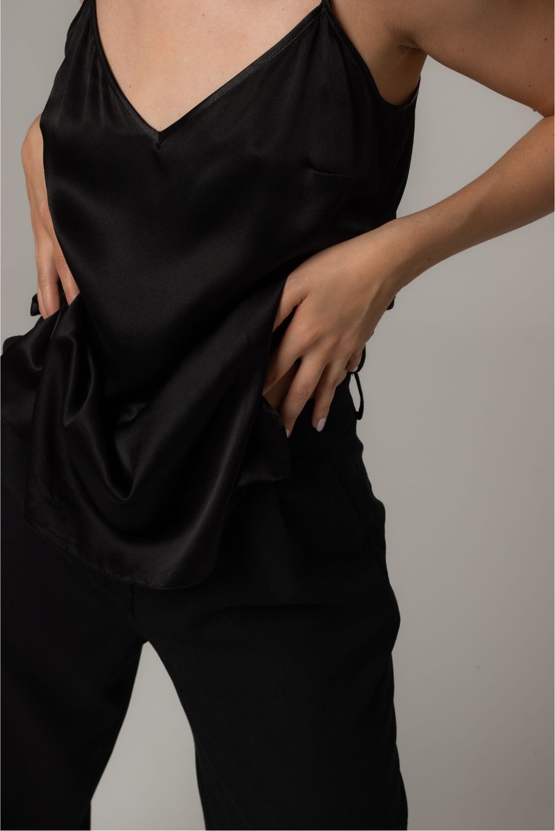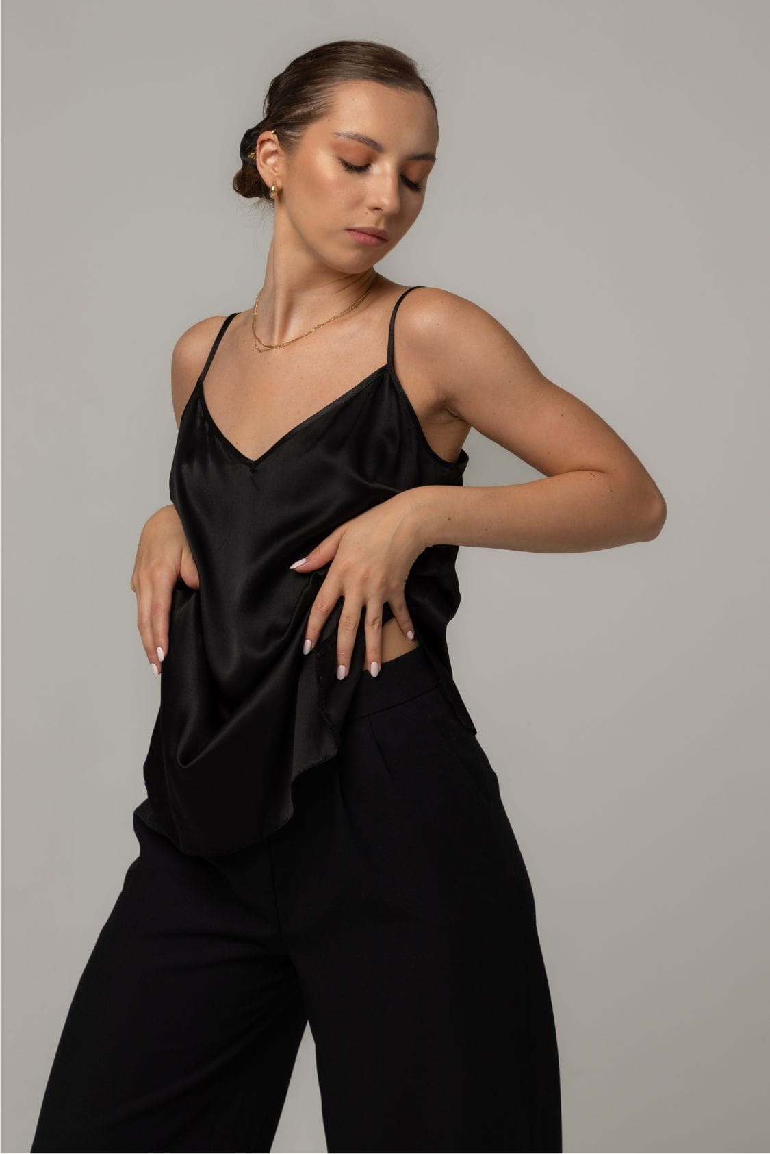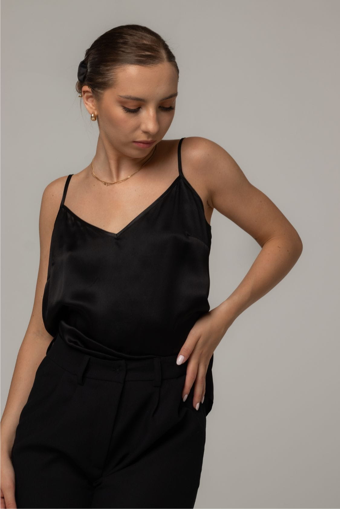 Ponadczasowy projekt topu na cienkich ramiączkach, o prostym i wygodnym fasonie z dekoltem V, wykonany z miękkiego naturalnego jedwabiu zmieni charakter Twojej stylizacji. Zaprojektowany i uszyty w naszej lokalnej szwalni, na terenie województwa świętokrzyskiego, zachwyci Cię jakością wykonania.