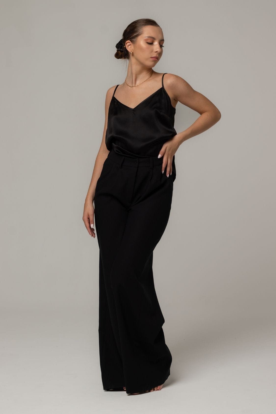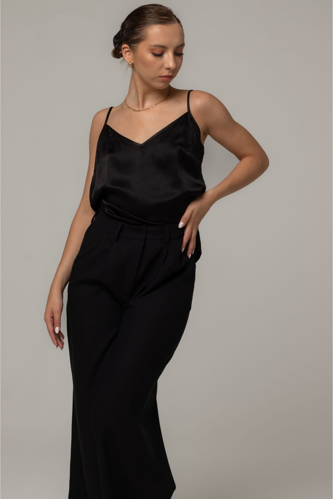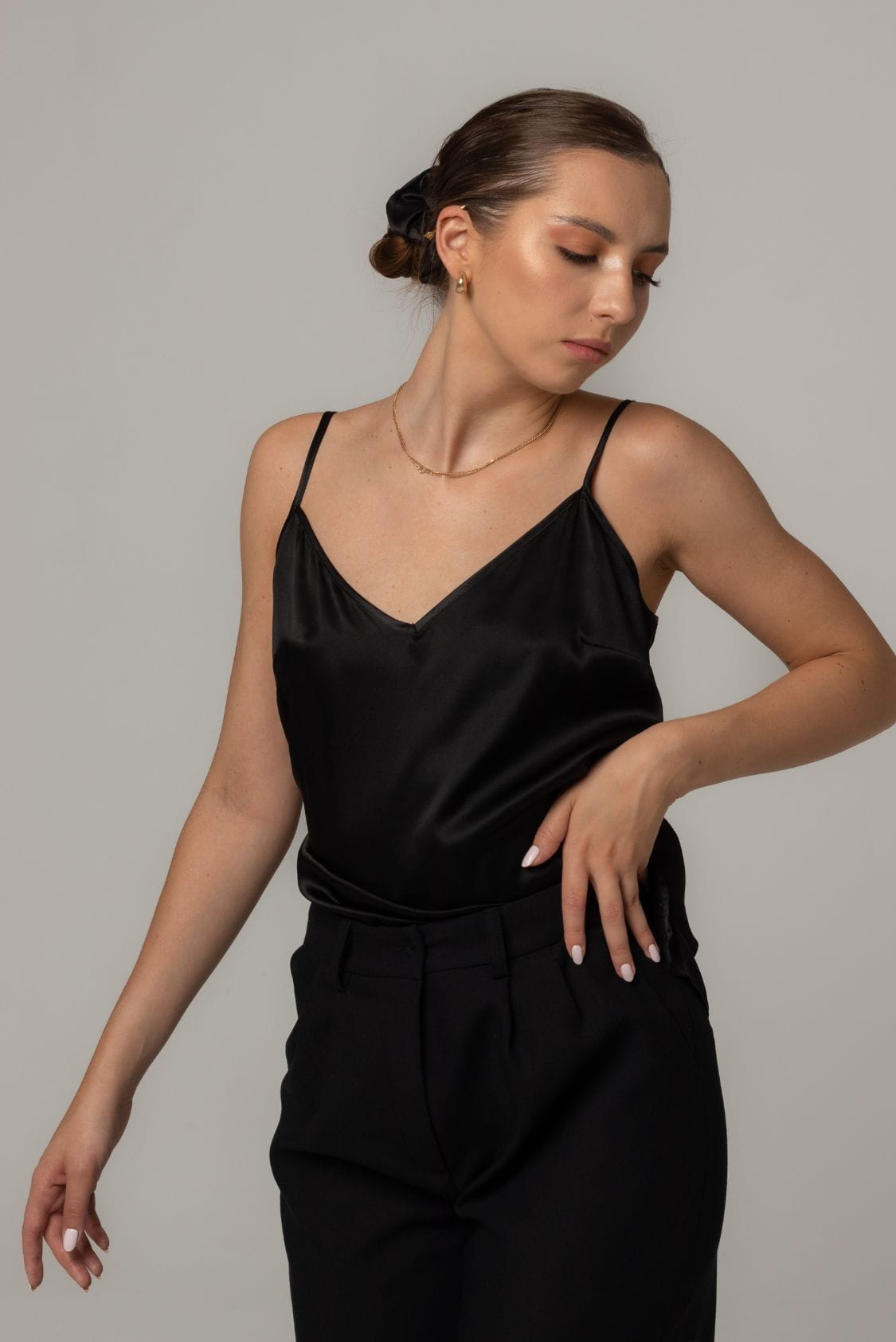 Ponadczasowy projekt topu na cienkich ramiączkach, o prostym i wygodnym fasonie z dekoltem V, wykonany z miękkiego naturalnego jedwabiu zmieni charakter Twojej stylizacji. Zaprojektowany i uszyty w naszej lokalnej szwalni, na terenie województwa świętokrzyskiego, zachwyci Cię jakością wykonania.
