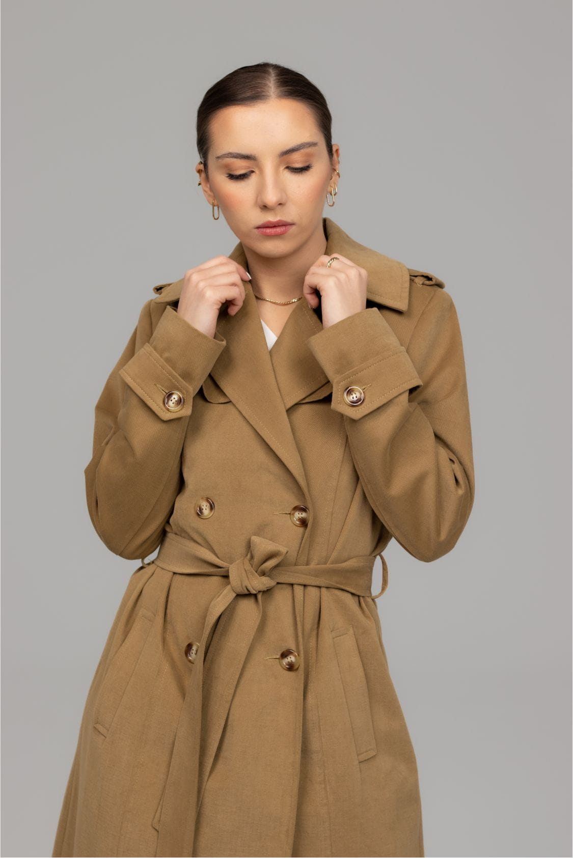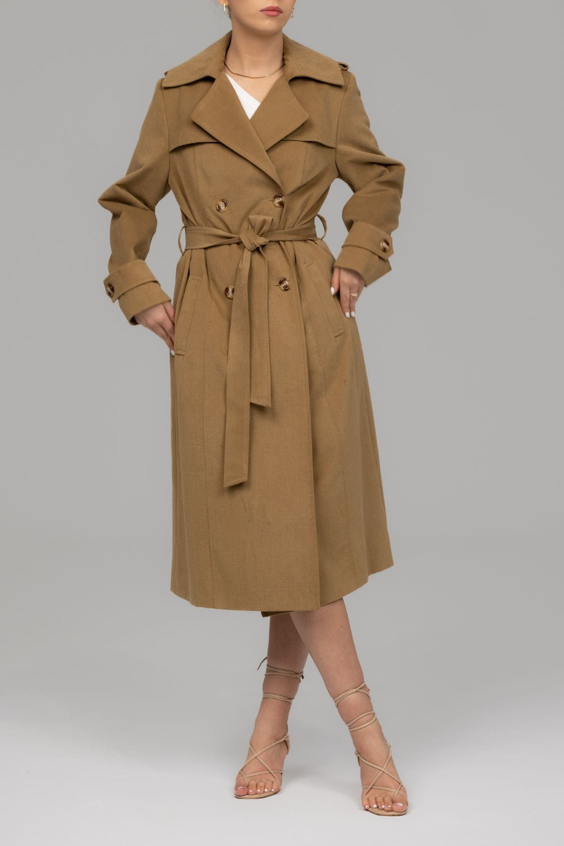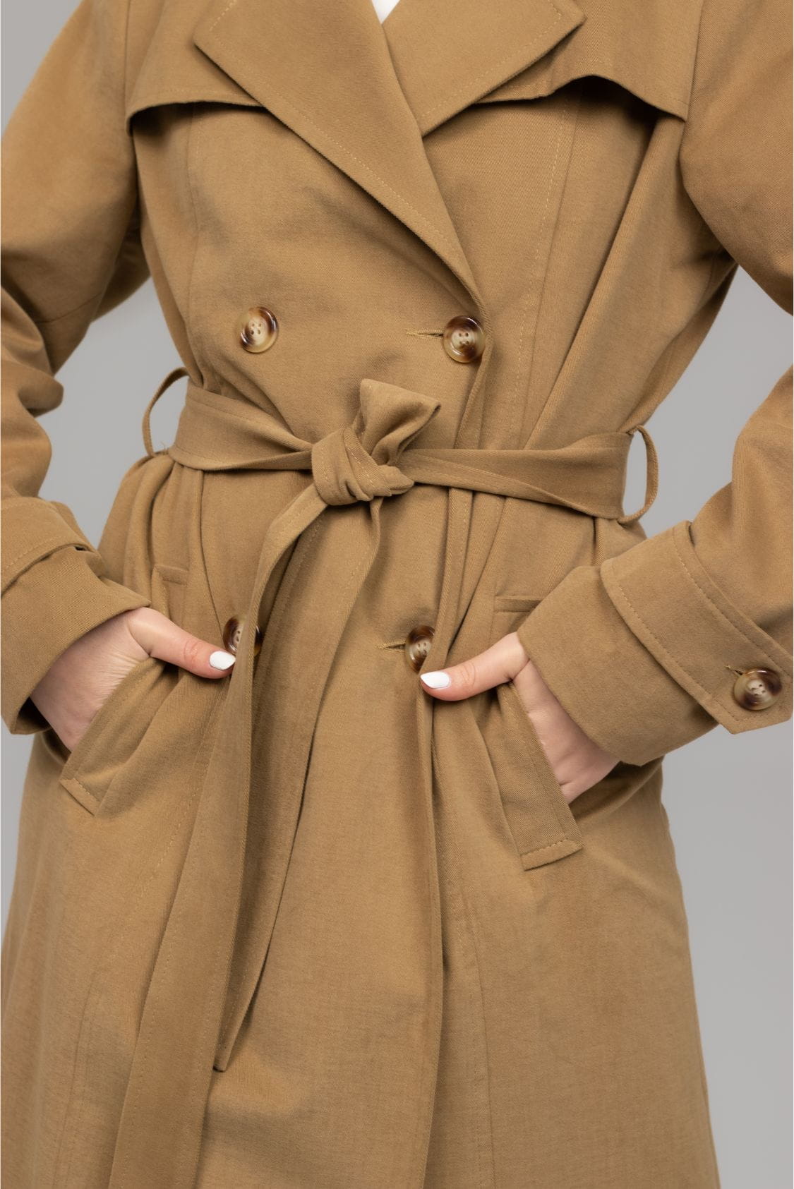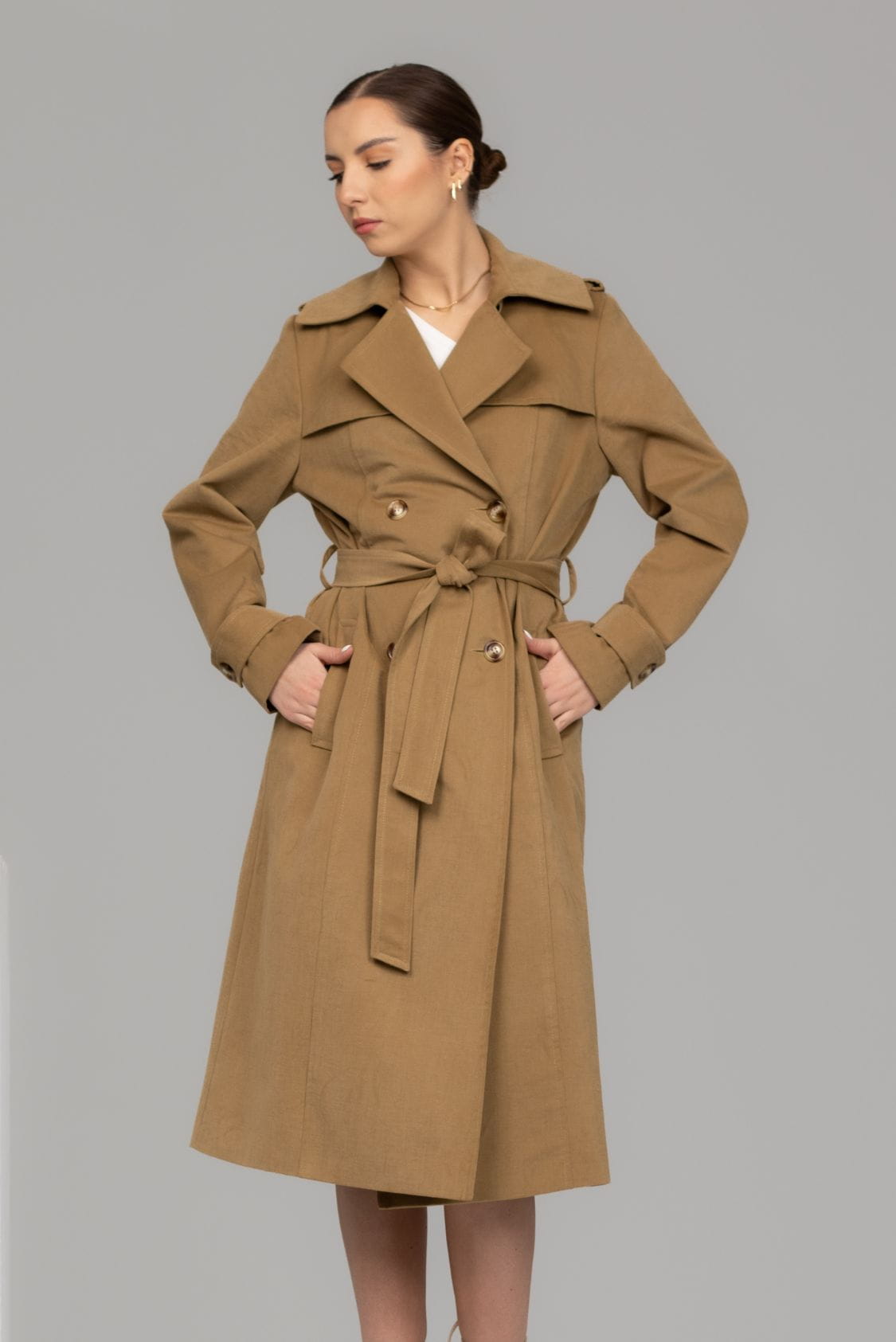 Bergen to ponadczasowy, klasyczny trencz z dwoma rzędami guzików o taliowanym kroju. Wykonany z miękkiej i miłej w dotyku gabardyny o delikatnie welurowym wykończeniu, co wpływa na niepowtarzalny komfort noszenia. Posiada klasycznie wszyty rękaw, który wysmukla sylwetkę. Na dole rękawów znajdują się ozdobne patki zapinane na guzik. Trencz Bergen posiada dwie, wpuszczane kieszenie, dwa rzędy guzików oraz dodatkowy pasek podkreślający talię. Z tyłu, na dole płaszcza znajduje się pęknięcie wydłużające optycznie sylwetkę, dzięki któremu trencz jest komfortowy w chodzeniu.