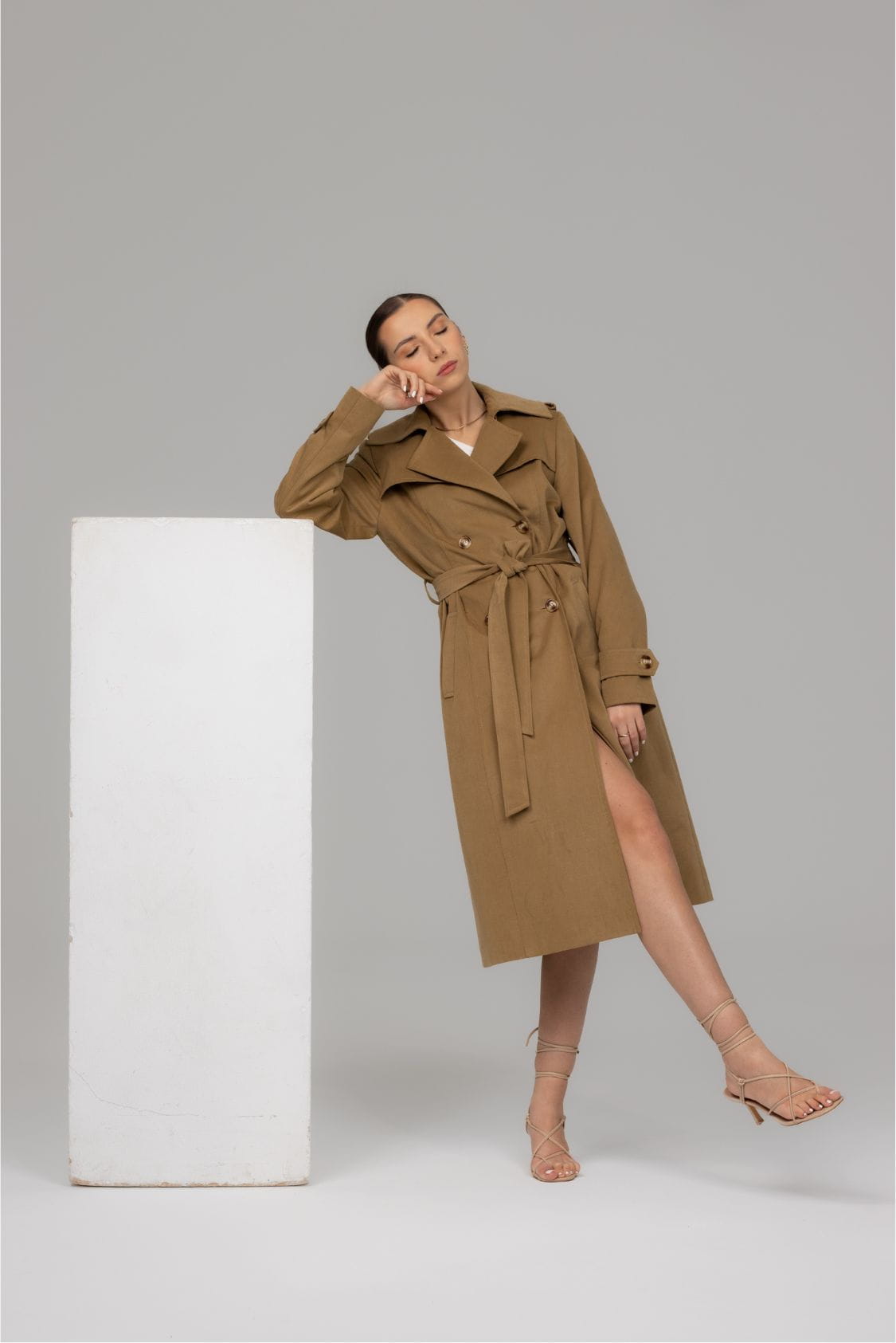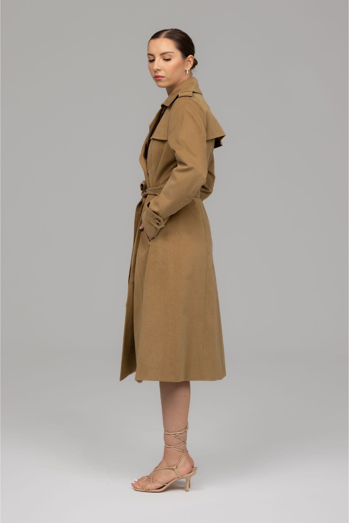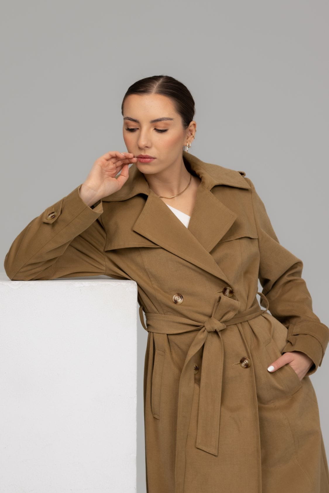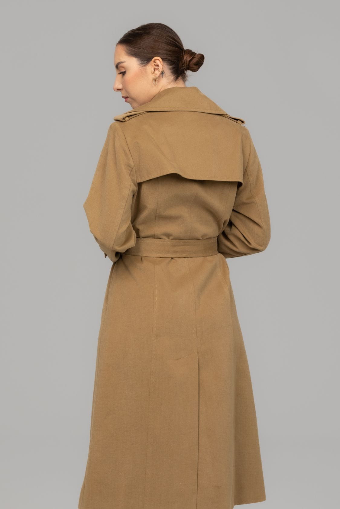 Bergen to ponadczasowy, klasyczny trencz z dwoma rzędami guzików o taliowanym kroju. Wykonany z miękkiej i miłej w dotyku gabardyny o delikatnie welurowym wykończeniu, co wpływa na niepowtarzalny komfort noszenia. Posiada klasycznie wszyty rękaw, który wysmukla sylwetkę. Na dole rękawów znajdują się ozdobne patki zapinane na guzik. Trencz Bergen posiada dwie, wpuszczane kieszenie, dwa rzędy guzików oraz dodatkowy pasek podkreślający talię. Z tyłu, na dole płaszcza znajduje się pęknięcie wydłużające optycznie sylwetkę, dzięki któremu trencz jest komfortowy w chodzeniu.